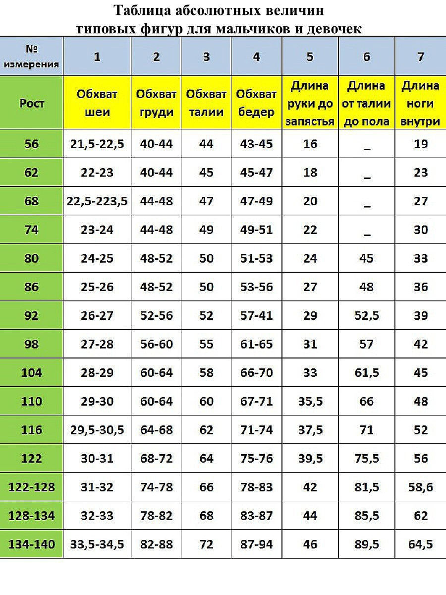 Возраст | Рост (см) | Размер (RUS) | Обхват груди, см | Обхват талии, см | Обхват бедер, см |