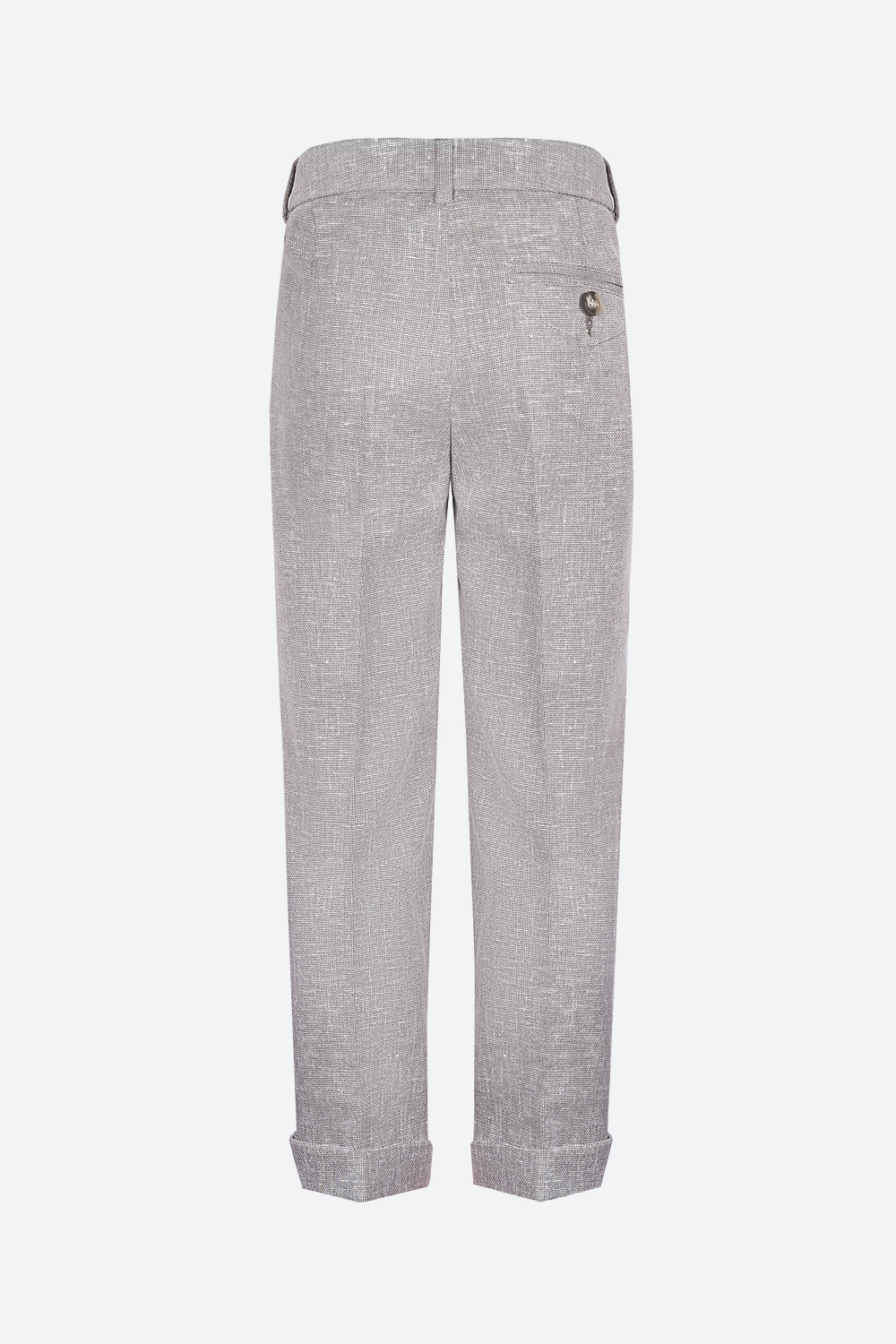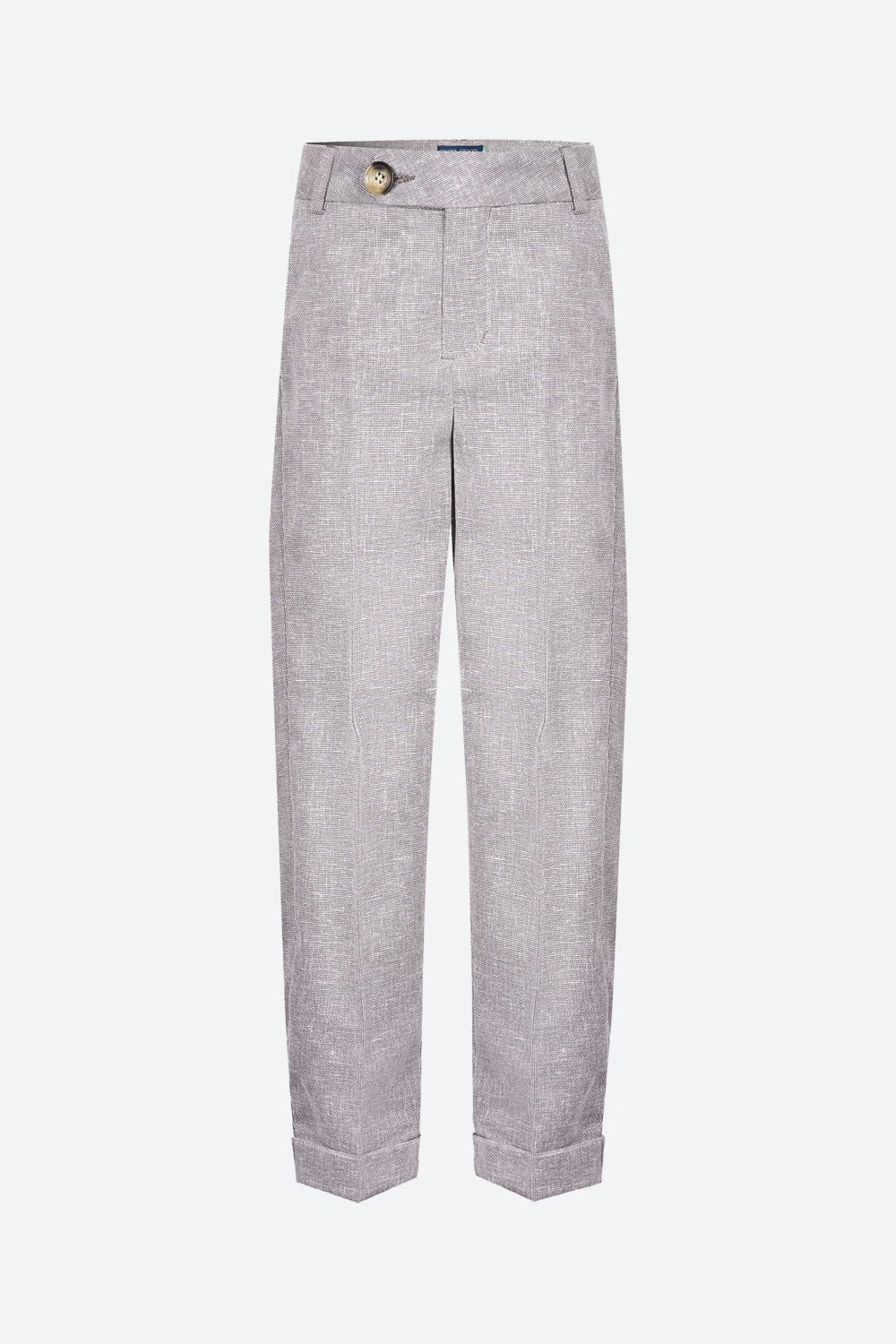 Прямые легкие брюки; Модель выполнена из костюмной ткани, которая хорошо держит форму. Лен и вискоза в составе обеспечивают воздухопроницаемость и комфорт к телу, а благодаря полиэстеру брюки износостойкие и меньше мнутся. Эластан отвечает за идеальную посадку; Удобные боковые карманы; Карман на пуговице на задней половинке брюк; Стрелки заутюжены; Отвороты по низу; Застежка на молнию и пуговицу.