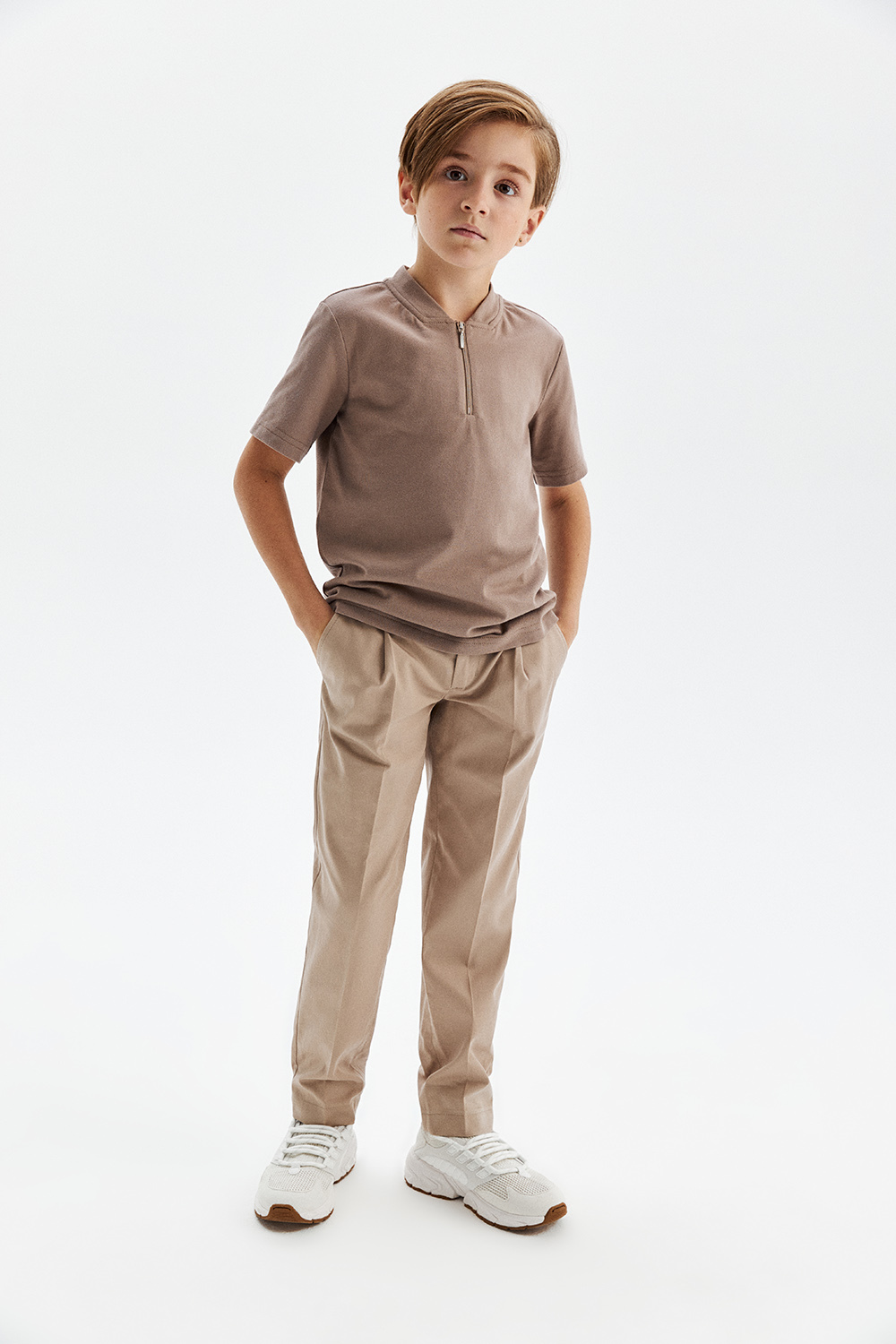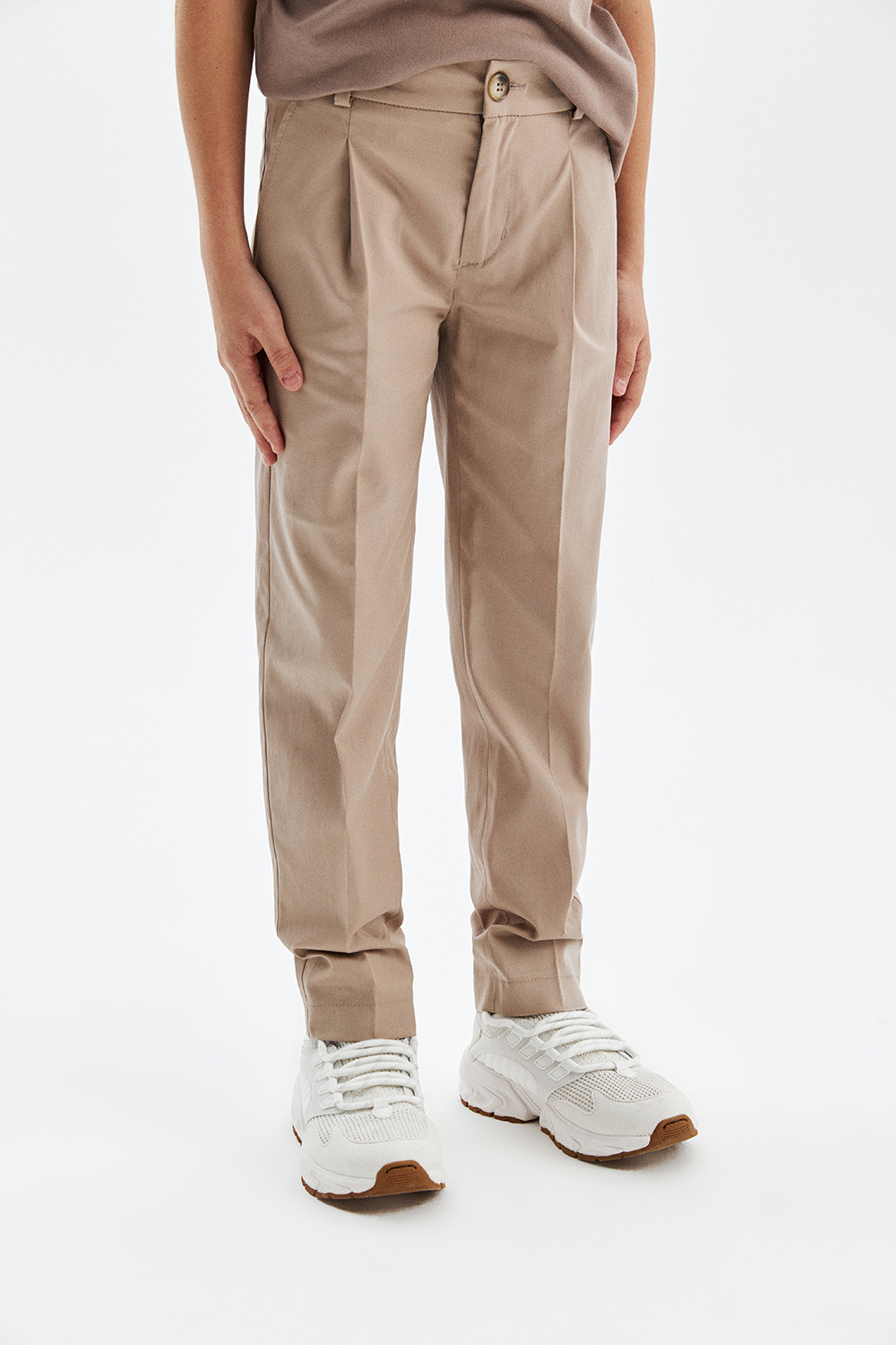 Прямые брюки чинос; Выполнены из плотной костюмной ткани. Хлопок и вискоза в составе обеспечивают воздухопроницаемость и комфорт к телу; Для идеальной посадки и в качестве декора предусмотрены регуляторы пояса на пуговицах; Удобные боковые карманы; Имитация кармана на задней половинке брюк; Стрелки заутюжены; Застежка на молнию и пуговицу.