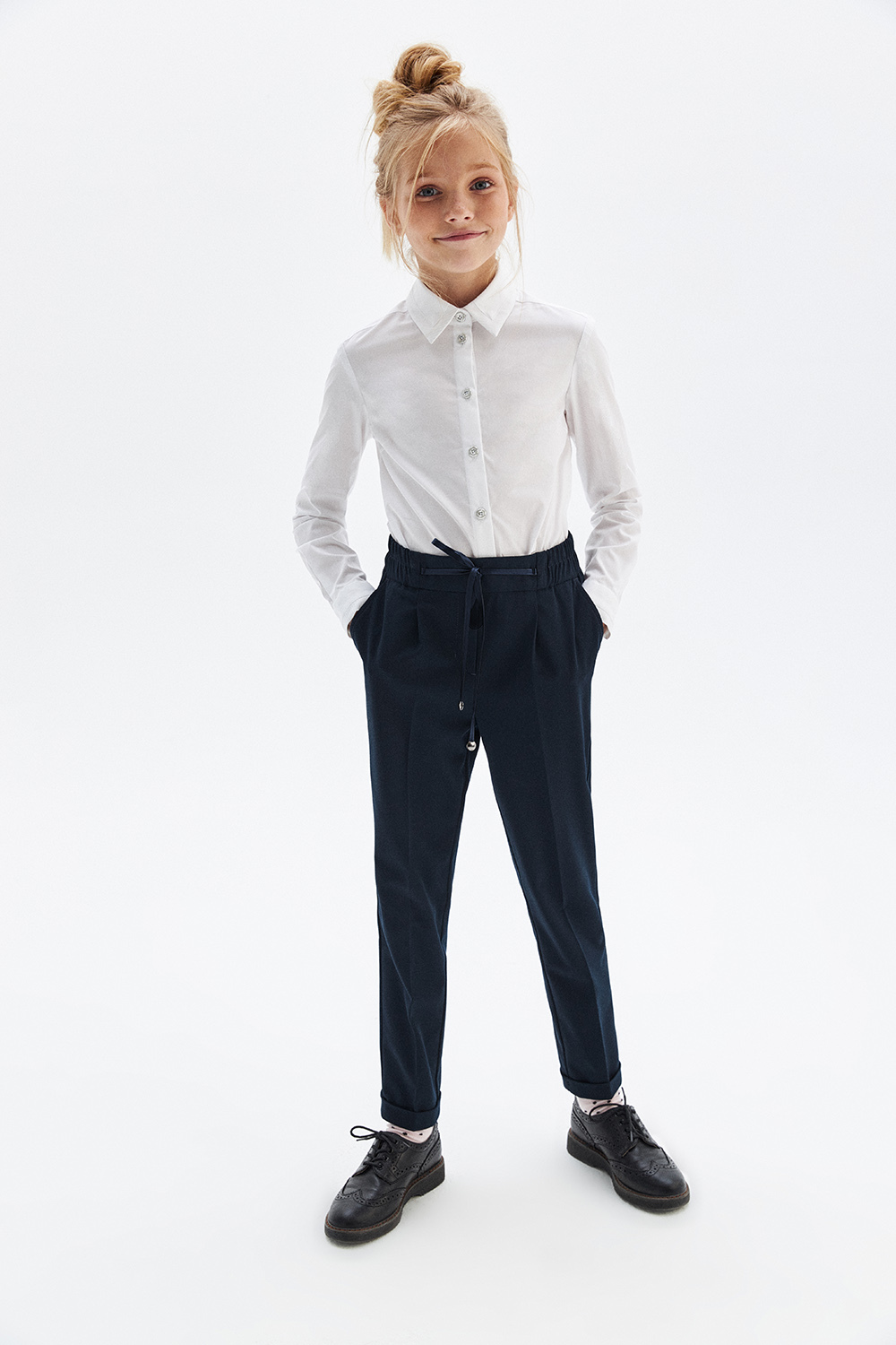 Зауженные брюки силуэта carrot с защипами и подворотами. Выполнены из костюмной ткани. Пояс на широкой мягкой резинке и декоративными шнурками из основной ткани. Имитация карманов на задних половинках брюк, декорированы брендированным шевроном.