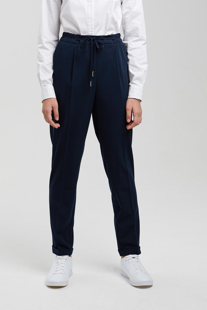 Зауженная модель силуэта «carrot»; Брюки выполнены из костюмной ткани. Вискоза в составе обеспечивает воздухопроницаемость и комфорт к телу, а благодаря полиэстеру брюки износостойкие и меньше мнутся. Эластан отвечает за идеальную посадку; Завышенная линия талии; Благодаря поясу на резинке удобно надевать и снимать; Декоративный поясок имеет стальные наконечники; Удобные боковые карманы и имитация карманов на задних половинках брюк; Стрелки заутюжены; Отвороты по низу брюк. Удобные и комфортные брюки на резинке. Хорошо садятся на любую фигуру. Отличный выбор на каждый день.