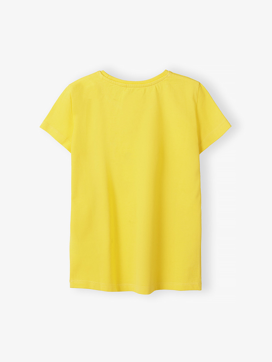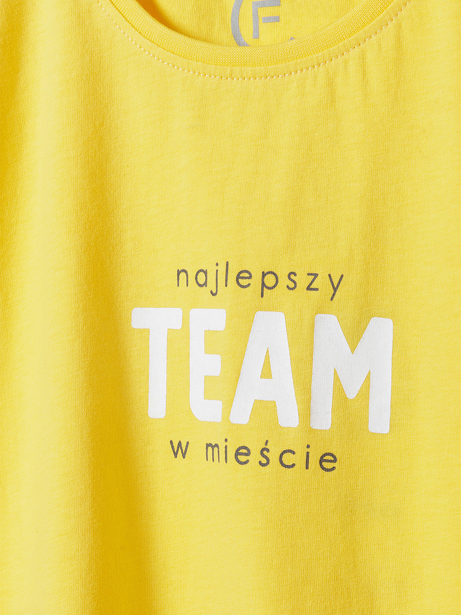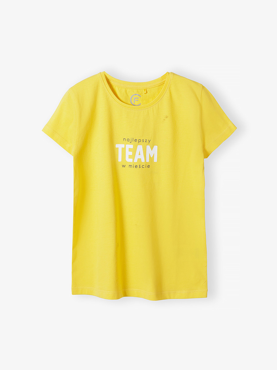 Желтая футболка для девочки изготовлена из высококачественного приятного на ощупь хлопкового трикотажа. Футболка имеет круглый вырез горловины, прямой крой, короткие рукава и украшена оригинальным принтом в виде надписи «лучшая команда города». Эта детская футболка подойдет к любому весеннему наряду и будет отлично смотреться в сочетании со спортивными штанами, джинсами, шортами, леггинсами и юбками.