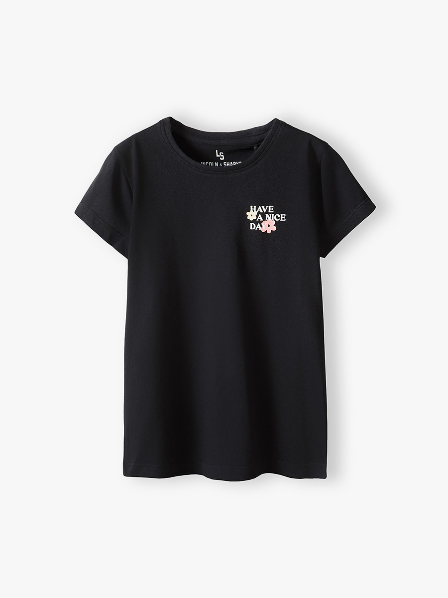 Черная футболка для девочки изготовлена из высококачественного приятного на ощупь хлопкового трикотажа. Футболка имеет круглый вырез горловины, прямой крой, короткие рукава и украшена принтом в виде цветов и надписью "хорошего дня". Эта детская футболка подойдет к любому весеннему наряду и будет отлично смотреться в сочетании со спортивными штанами, джинсами, шортами, леггинсами и юбками.