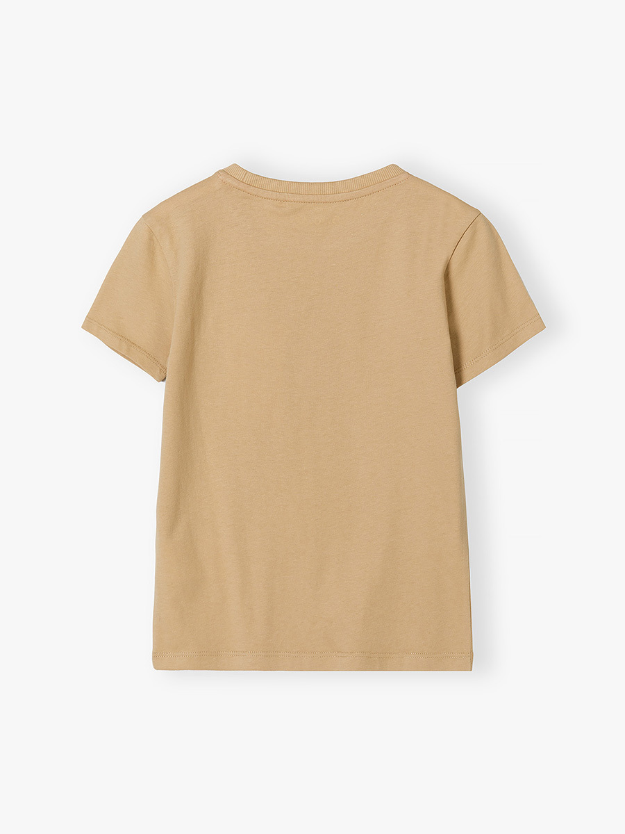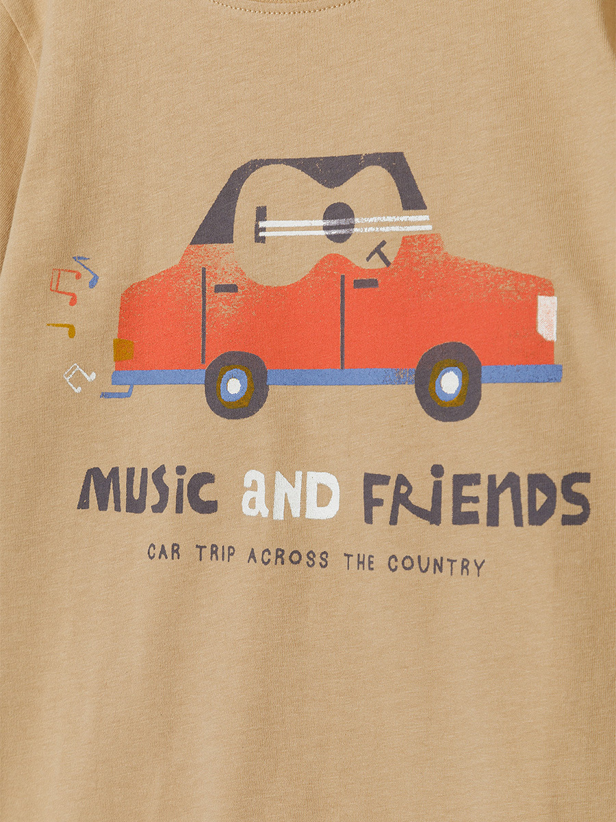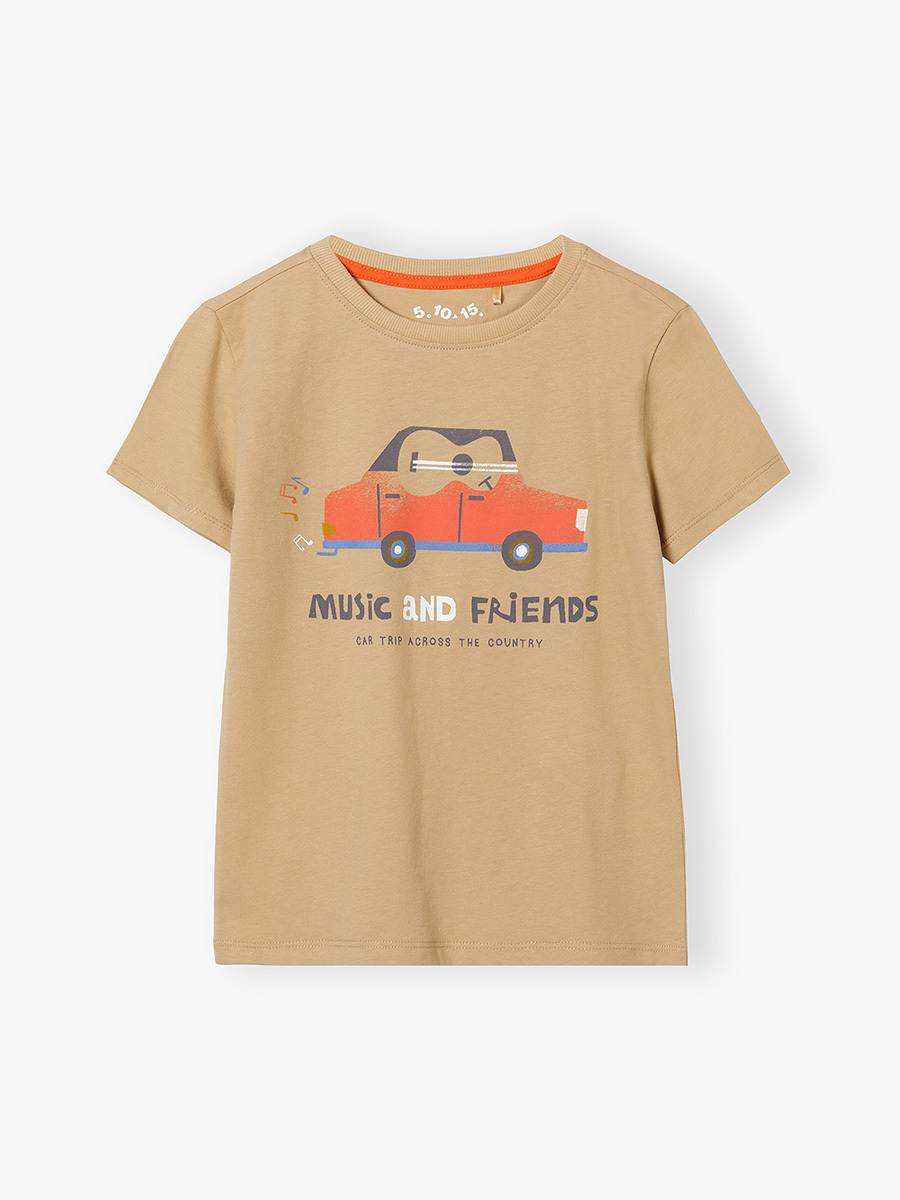 Бежевая футболка для мальчика выполнена из качественного хлопкового трикотажа. Имеет круглый вырез горловины, короткие рукава и украшена оригинальным принтом в виде машины. Благодаря качественному материалу и грамотному крою, изделие максимально комфортно для ребенка. Футболка отлично подойдет для летнего отдыха на свежем воздухе или в отпуске. Идеально подходит для любителей музыки. Надпись переводится, как «музыка и друзья, автомобильное путешествие по стране».