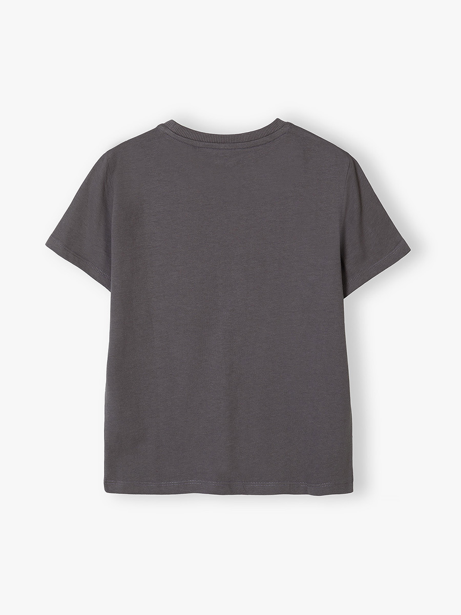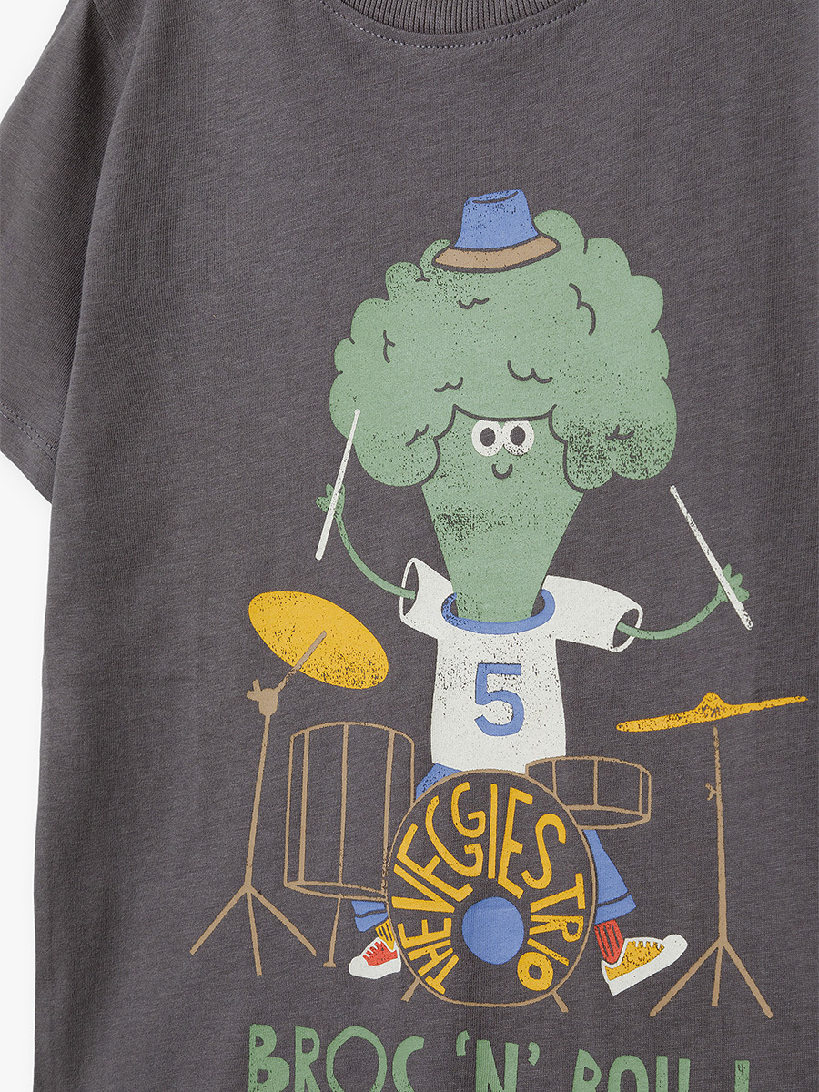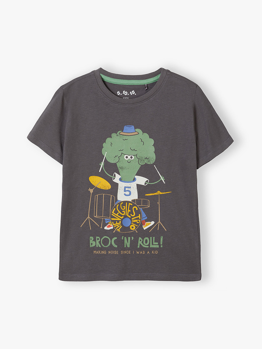 Серая футболка для мальчика выполнена из качественного хлопкового трикотажа. Имеет круглый вырез горловины, свободный крой, короткие рукава и украшена оригинальным принтом в виде брокколи, которая играет на ударной установке. Благодаря качественному материалу и грамотному крою, изделие максимально комфортно для ребенка. Футболка отлично подойдет для летнего отдыха на свежем воздухе или в отпуске. Идеально подходит для любителей музыки. Надпись переводится, как "BROC 'N' ROLL! Шумит с детства!».