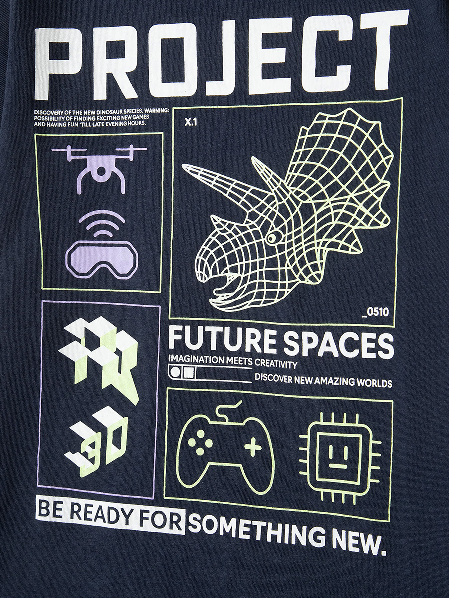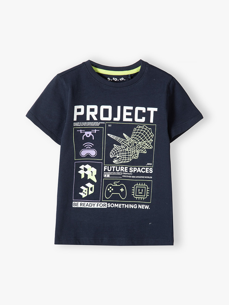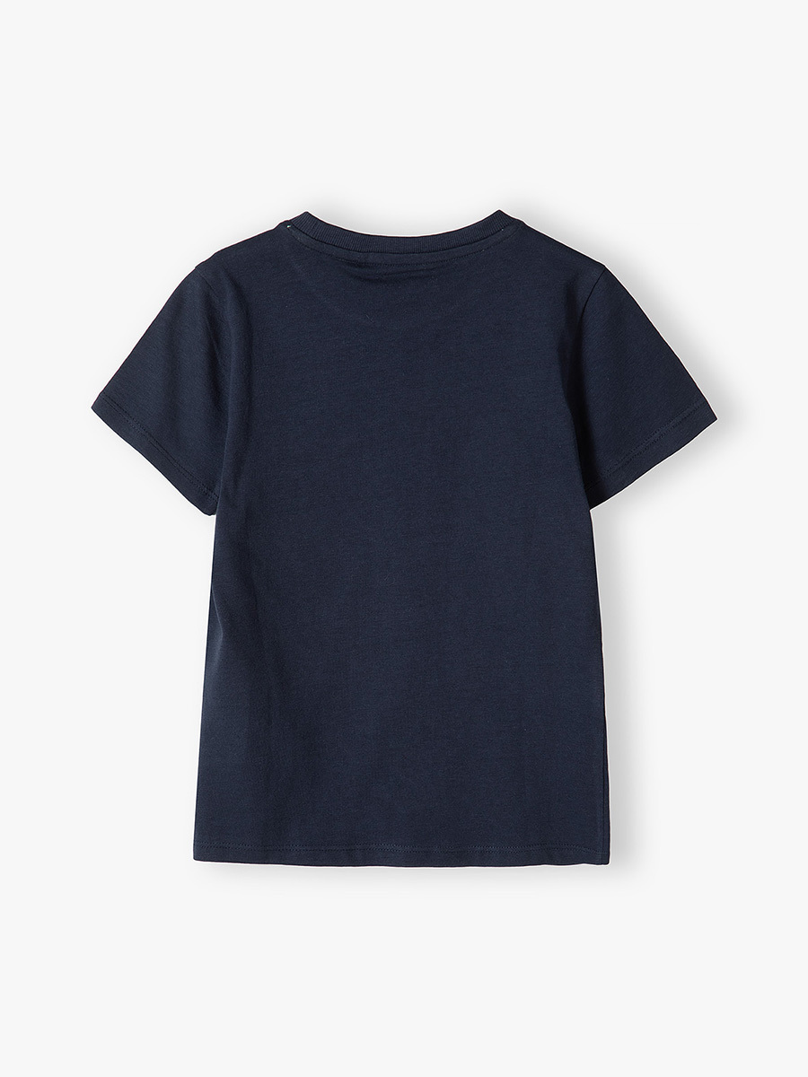 Футболка темно-синего цвета для мальчика выполнена из качественного хлопкового трикотажа, мягкого и приятного на ощупь, не раздражает чувствительную кожу ребенка. Футболка имеет круглый вырез горловины, прямой крой, короткие рукава и украшена оригинальным принтом. Благодаря качественному материалу и грамотному крою, изделие максимально комфортно для ребенка. Футболка отлично сочетается с шортами, джинсами, спортивными штанами и брюками.