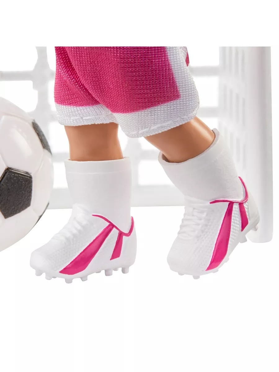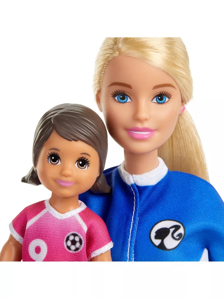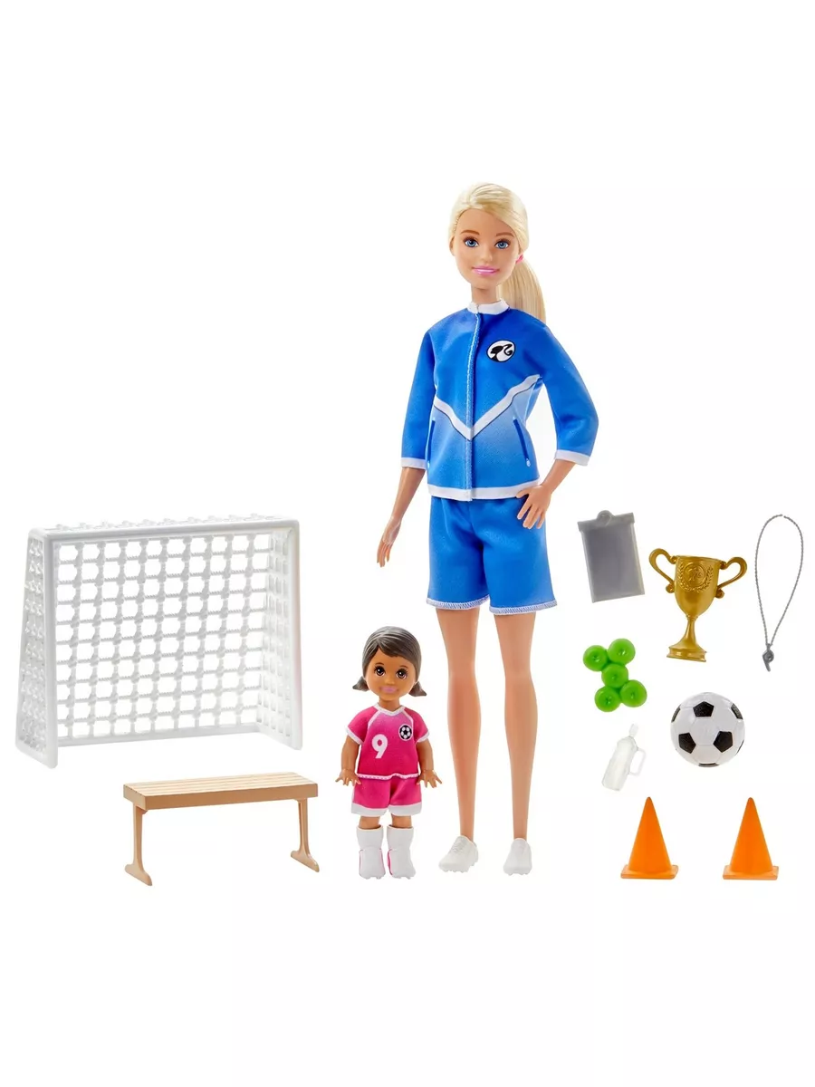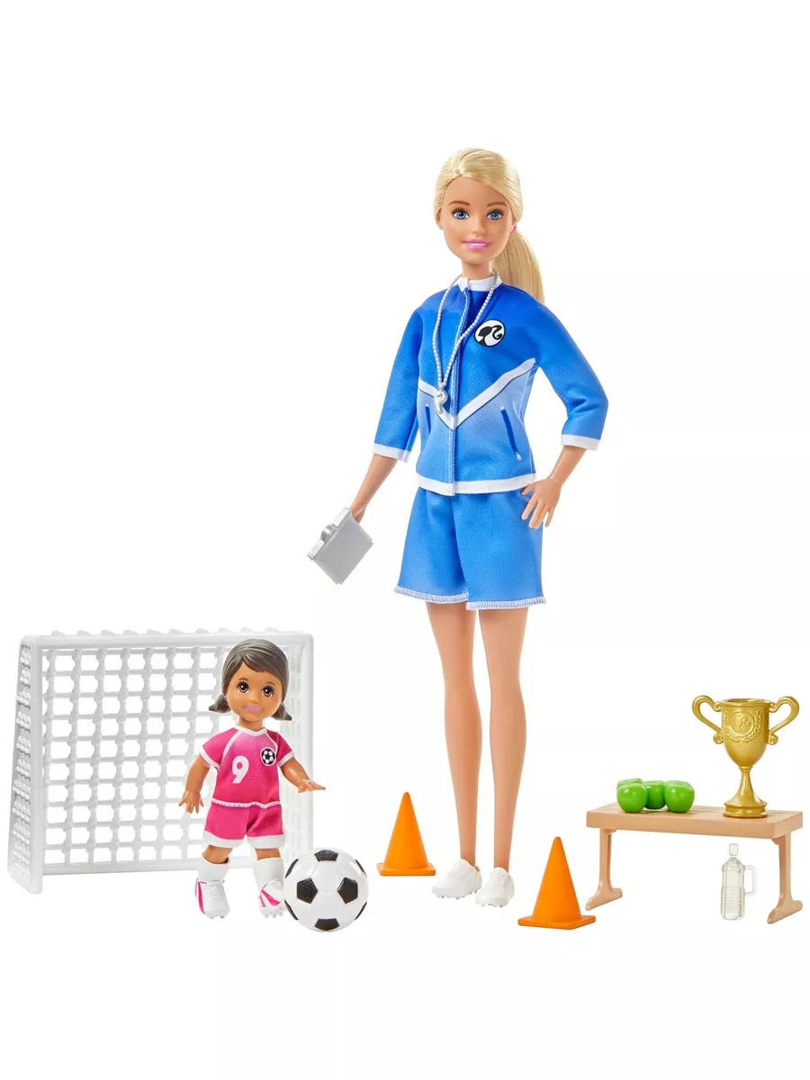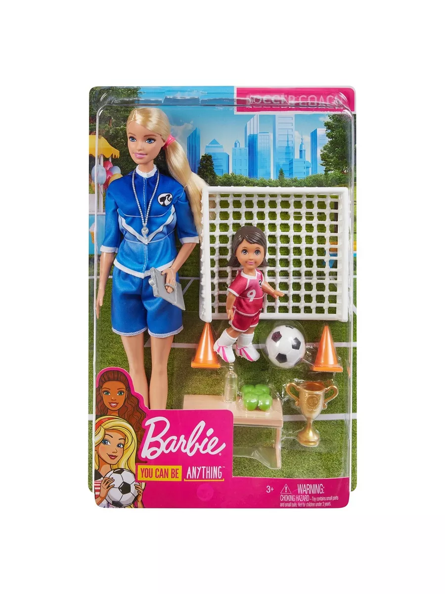 Исследуйте мир спорта вместе с куклой Барби “Футбольный тренер”! Игра с куклой поможет вашему ребенку узнать больше о профессии футбольного тренера. Кукла одета в синюю футбольную форму и бутсы, а ее милая ученица в розовую футбольную форму и бутсы. Ребенок может выбрать все виды тренировок и поиграть в футбол с обеими куклами и аксессуарами, такими как футбольный мяч, сетка для ворот, два конуса, скамья, яблоко и другими. Усердная работа, сила и решимость куклы Барби приведут ее команду к заслуженному трофею! Вашему ребенку понравятся бесконечные возможности для творческого самовыражения! Расцветка и оформление могут отличаться. Кукла не может стоять без опоры.