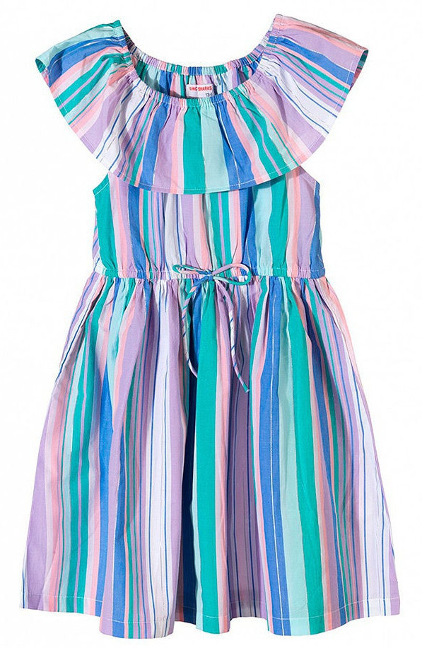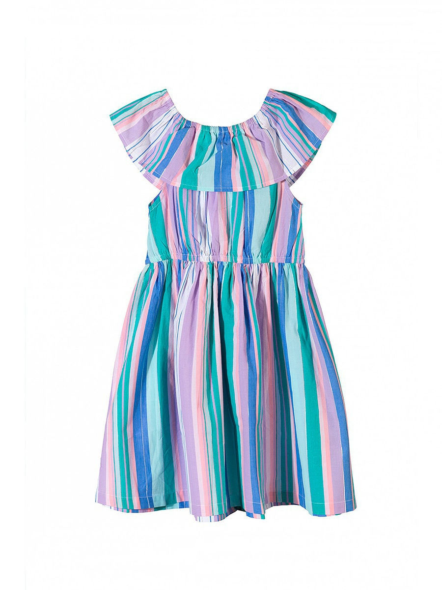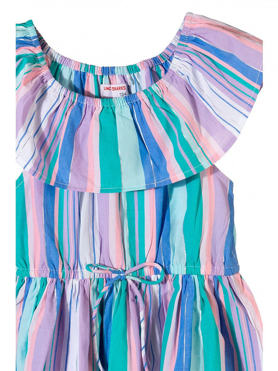 Модель выполнена из хлопковой ткани с металлизированной нитью. Детали: - горловина собрана на резинку; - круглый вырез; - на плечах оборка; - на талии завязки; - принт в полоску по всему изделию.