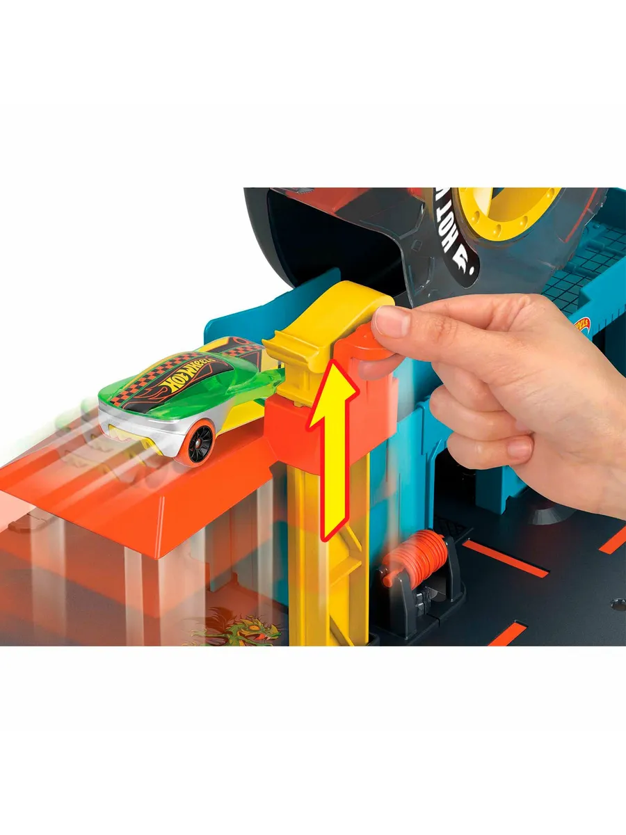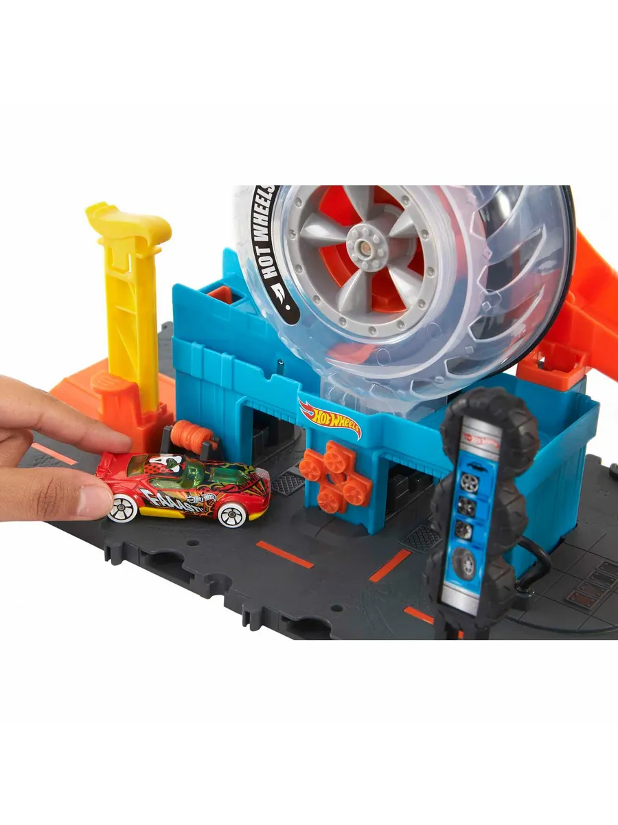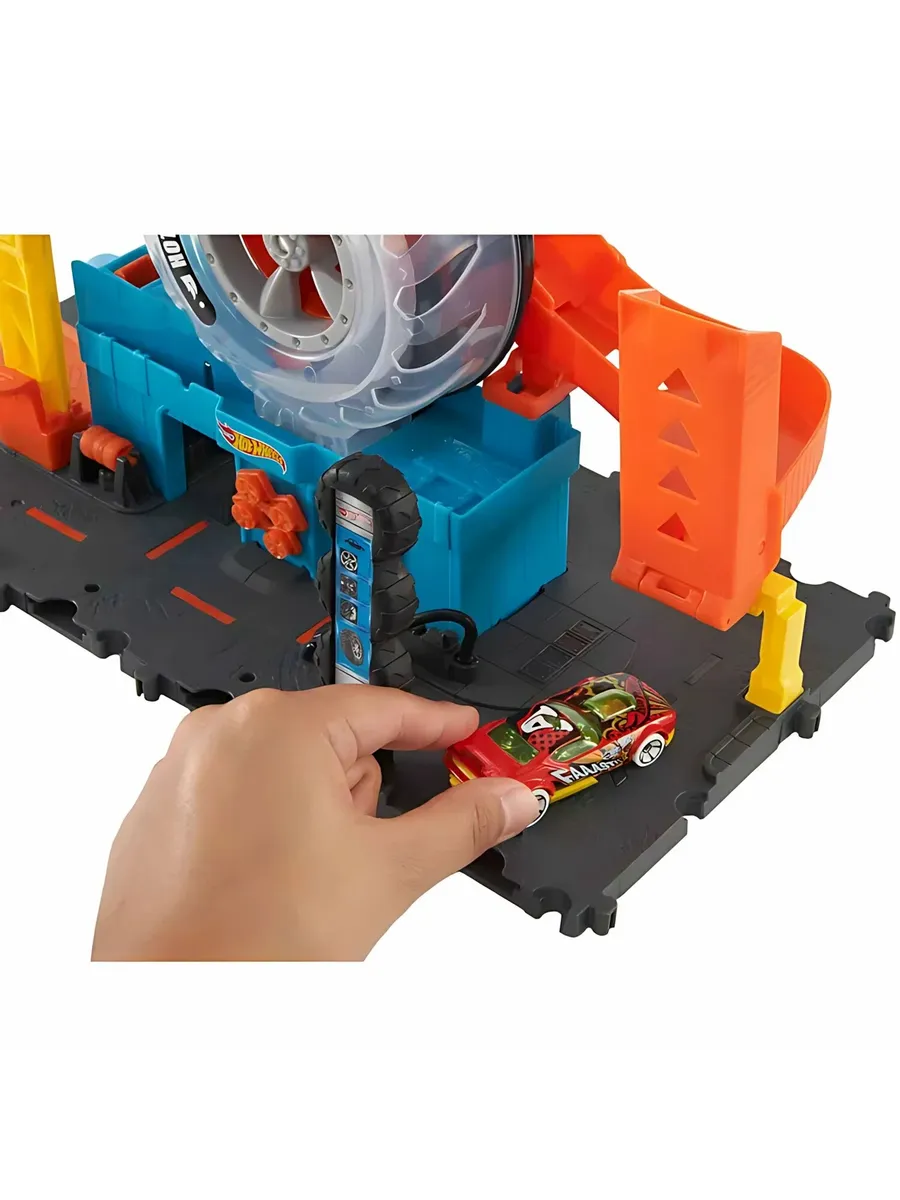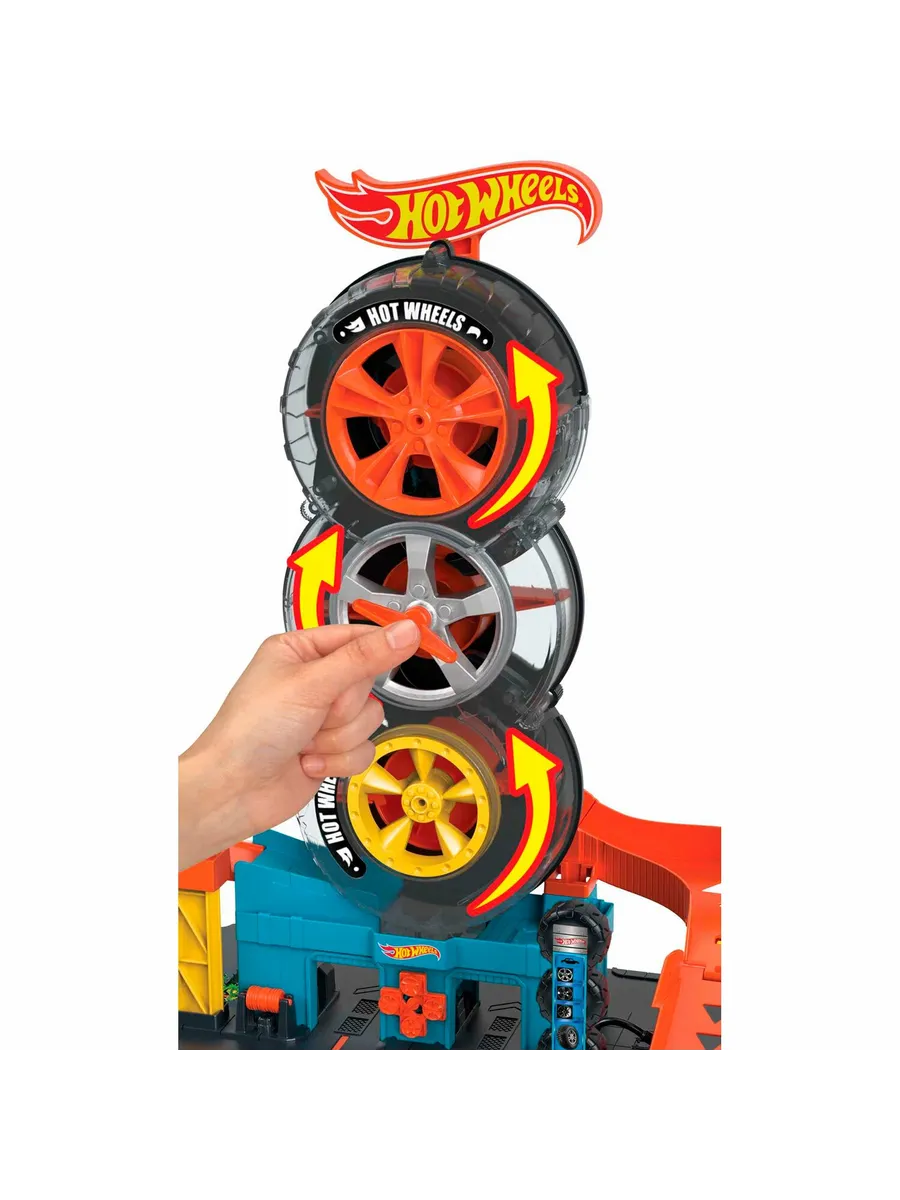 С игровым набором Hot Wheels City «Шиномонтажная мастерская» ребенок сможет проявить свою ловкость. Многочисленные изгибы и повороты делают игру увлекательной и непредсказуемой. Чтобы начать гонку, достаточно покрутить оранжевый ключ, и машинки помчатся через прозрачные колеса мастерской. Достигнув вершины, авто зрелищно спустятся рампой.
