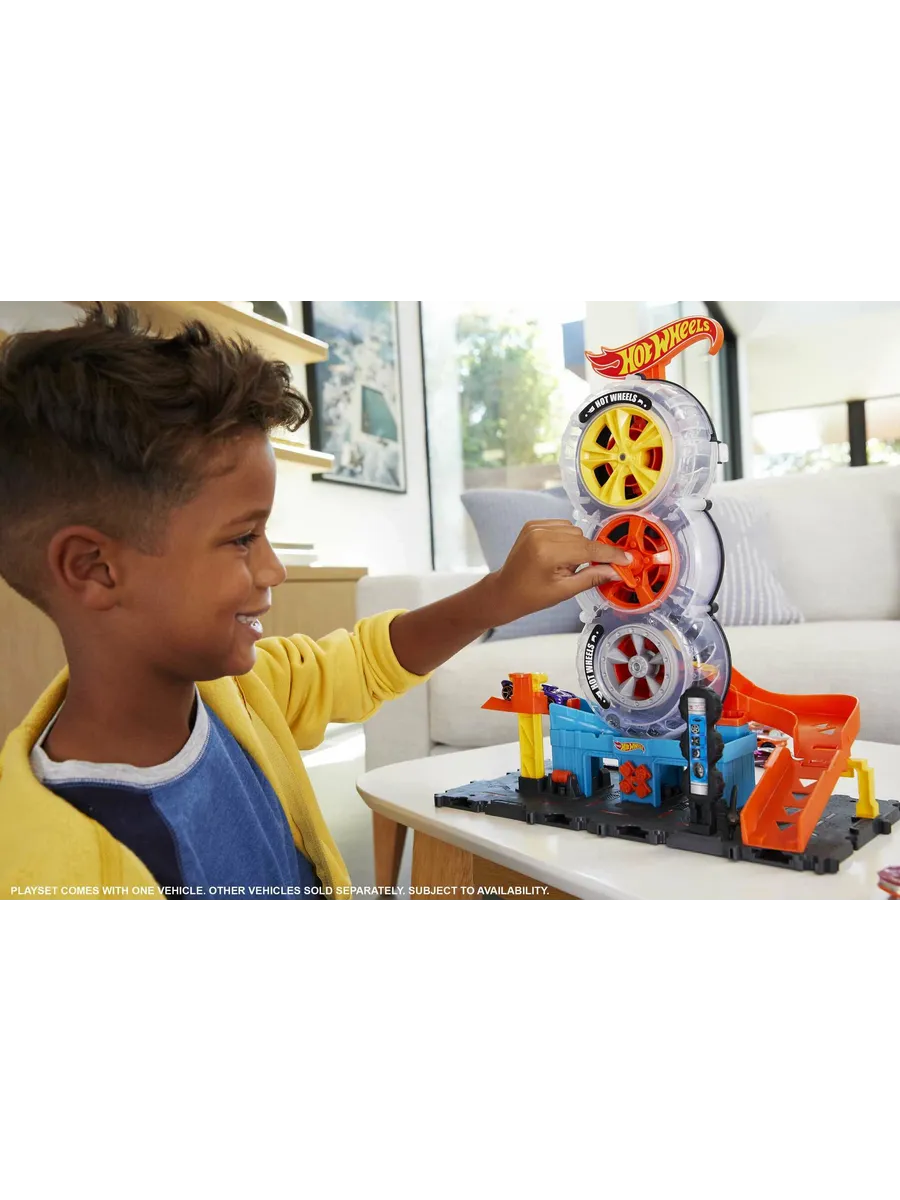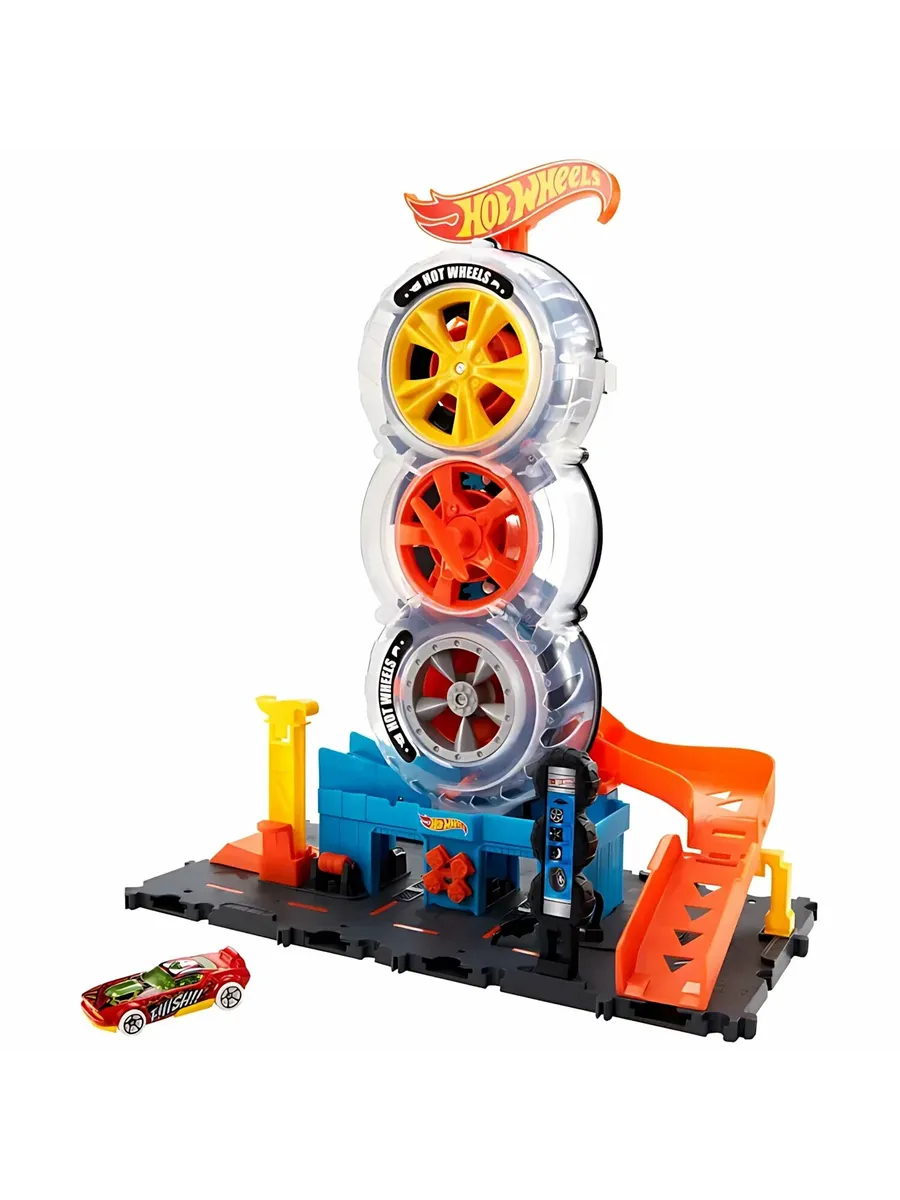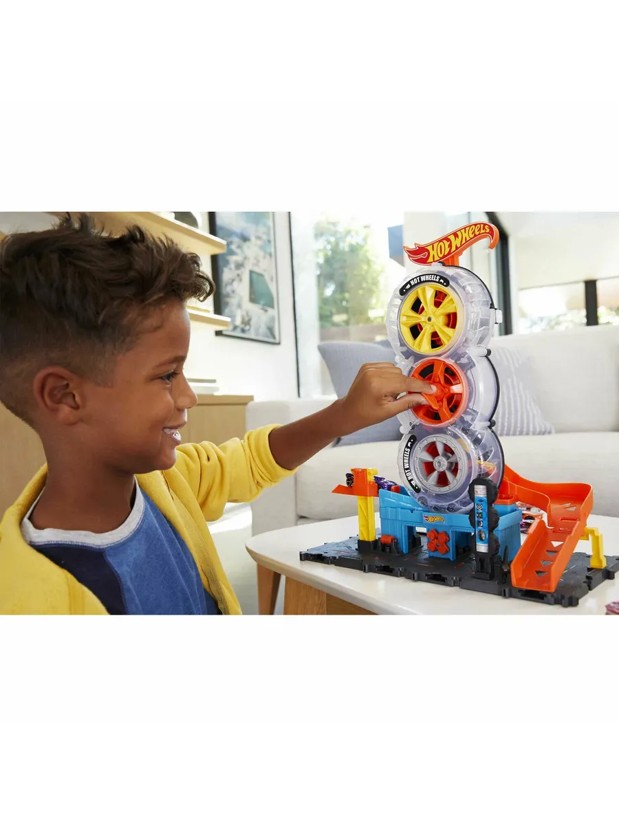 Пришло время скоростных действий вместе с Мастерской гоночных шин Hot Wheels — поверните ключ в центре и провезите машины через полупрозрачные шины !