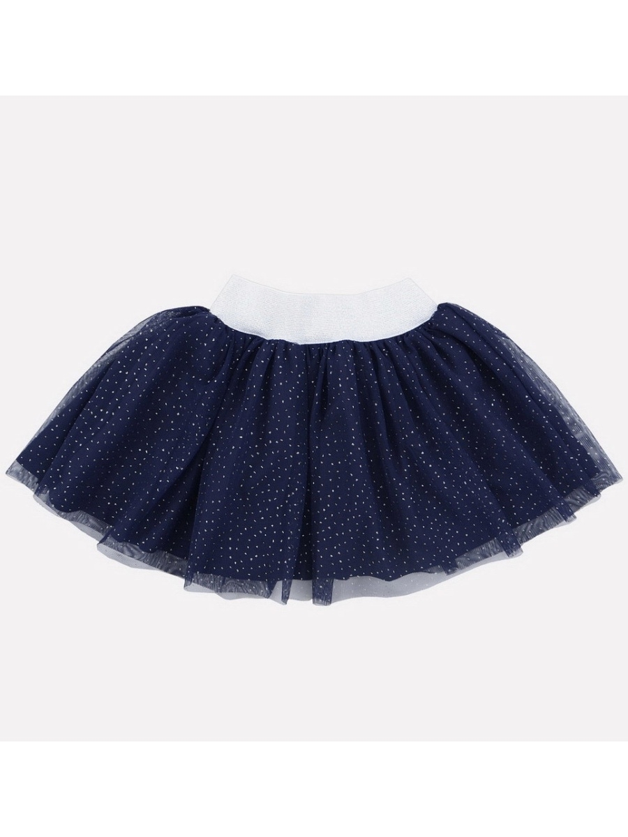 Юбка для девочки, выполнена со сборкой. Верхний слой из сетки с напылением в серебристую крапинку, нижний из трикотажного хлопка. Пояс на эластичной серебристой резинке.