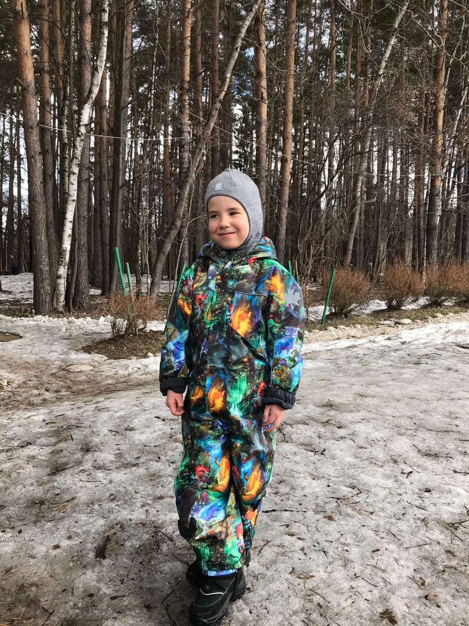 Комбинезон очень понравился, сделан очень качественно. Подкладка хлопковая. Ткань не жесткая, но на ощупь прочная. Расцветка яркая и интересная, при этом грязь не сильно видна. Взяли размер 110, когда распаковывали было ощущение, что огромный, но когда одели всё встало на свои места) Рост у нас 108 см, запас есть хороший, рукава пока подвернули.По теплости, сейчас на холодную весну от 0 до 6-7 градусов самое то, думала сразу взять потоньше, но решила не рисковать, лучше потом куплю на более теплую погоду тонкий на флисе.