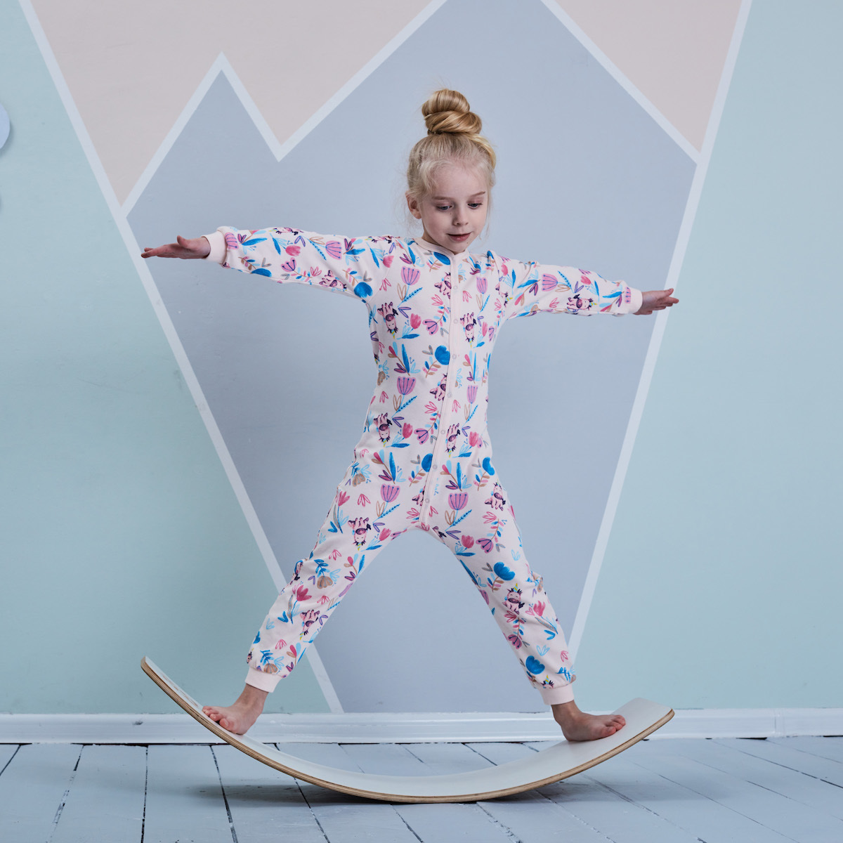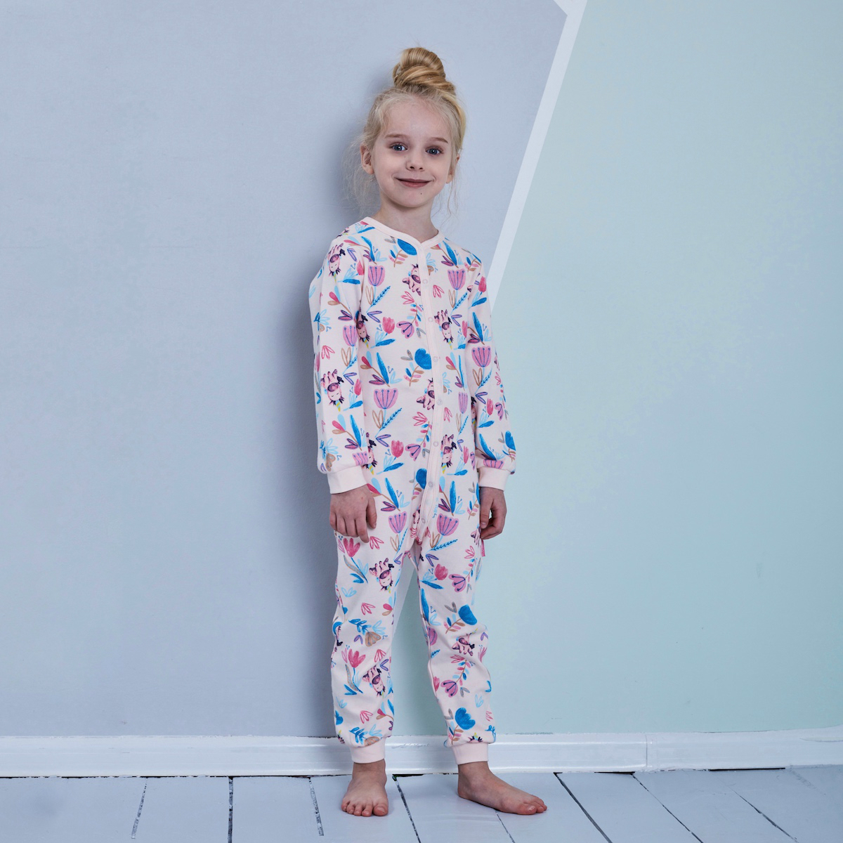 Комбинезон для девочки с длинным рукавом из натурального хлопка светло-розового цвета. Приятный на ощупь трикотаж с ярким набивным рисунком "Единороги в цветах". Удобная застежка на кнопки, эластичные манжеты на рукавах и ножках будут удобны вашему ребенку. Окантовка и фурнитура выполнена в цвет основного полотна. Для размера 86 застежка предусмотрена по длине ножки для смены подгузника. Размеры 92-110 - застежка до бедер. Можно использовать как домашнюю одежду или пижаму.