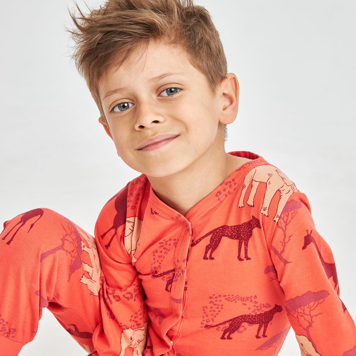 Комбинезон для мальчика с длинным рукавом из натурального хлопка темно-красного цвета. Приятный на ощупь трикотаж с набивным рисунком "саванна". Удобная застежка на кнопки, эластичные манжеты на рукавах и ножках будут удобны вашему ребенку. Окантовка и фурнитура выполнена в цвет основного полотна. Можно использовать как домашнюю одежду или пижаму.