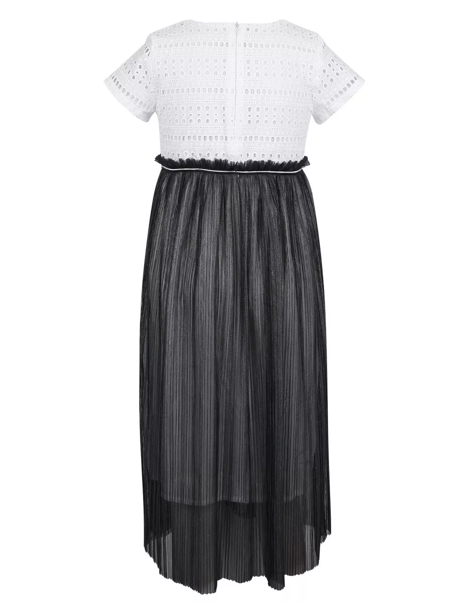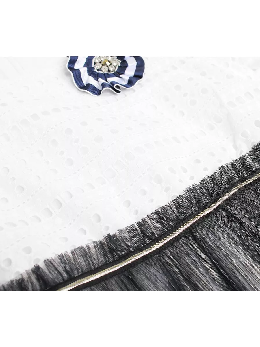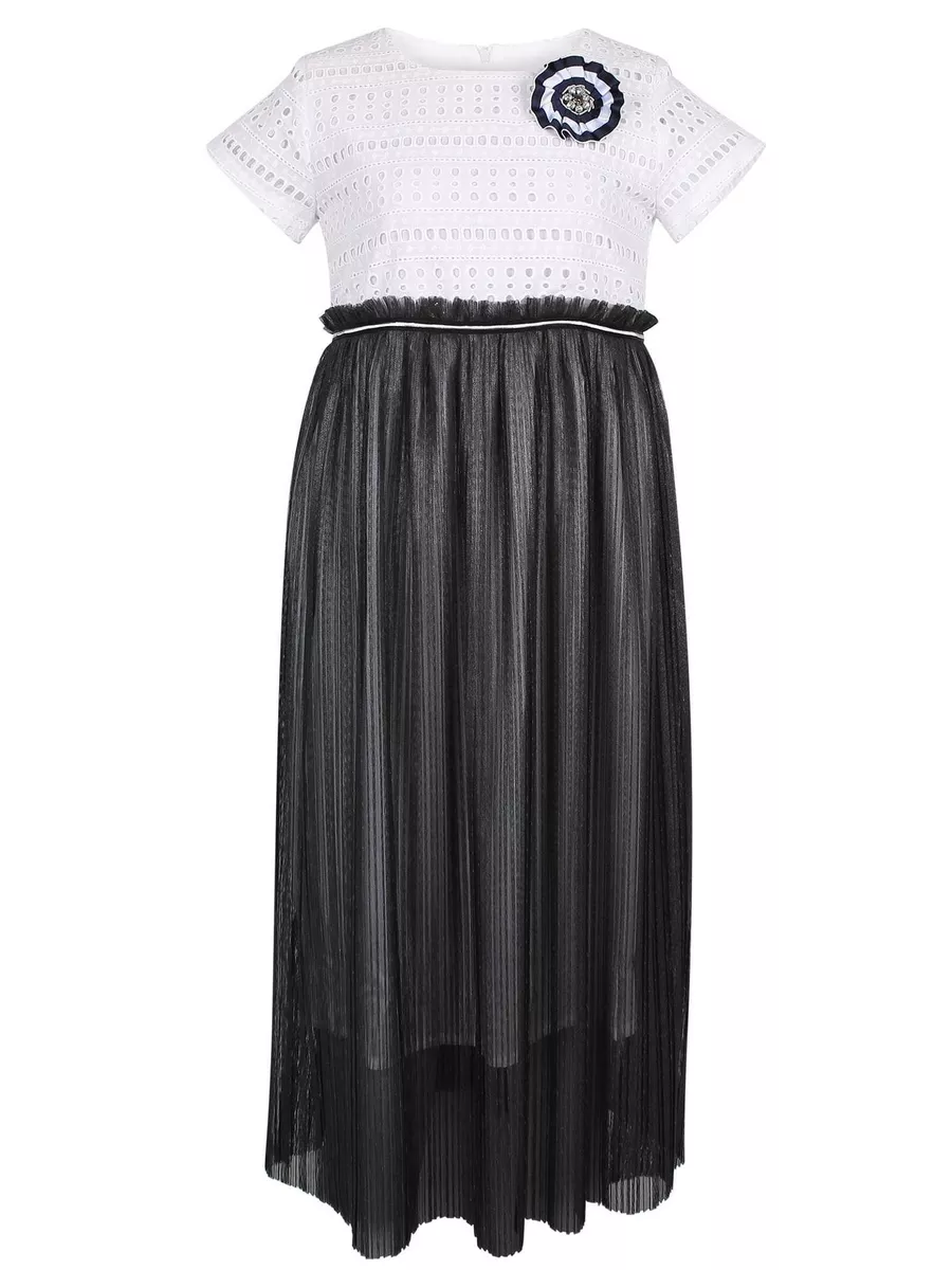 Великолепное летнее платье REMIX для девочки, от него так и веет морским бризом при закате, когда после утомительной жары можно прогуляться по берегу, конечно выбрав для этого самый лучший наряд. Платье сочетает в себе белый верх, блузку из "шитья", и юбку из синего фатина на подкладке из натурального материала. Изделие выигрышно будет смотреться на любой фигуре и будет уместно в повседневной носке и на более торжественном событии. Верх платья украшен изящной брошкой-розеткой, повторяющей цвета платья, верхняя оборочка юбки придает изделию игривость. Застегивается платье на замок- молнию сзади.