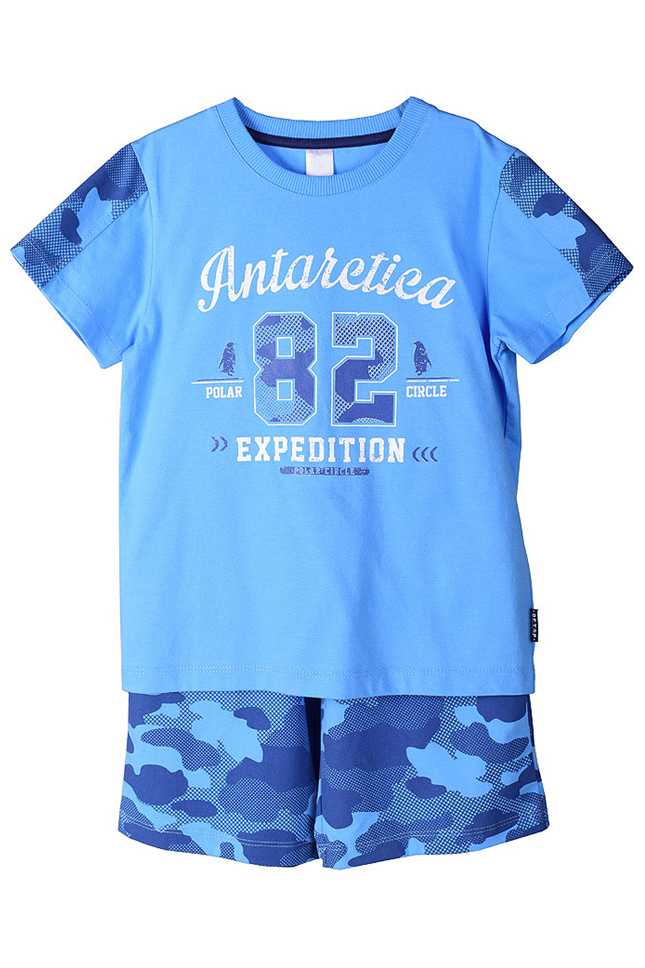 Комплект из супрема. футболка однотонная с коротким втачным рукавом, по горловине обтачка из рибаны, по рукаву вставка из набивного полотна, на полочке печать, жаккард в боковом шве. В размерах 52-92 и 56-98 застёжка на 2 кнопки в плече. Шорты из супрема с набивкой, пояс из кашкорсе, в поясе тесьма эластичная, киперная лента, имитация гульфика, боковые карманы.