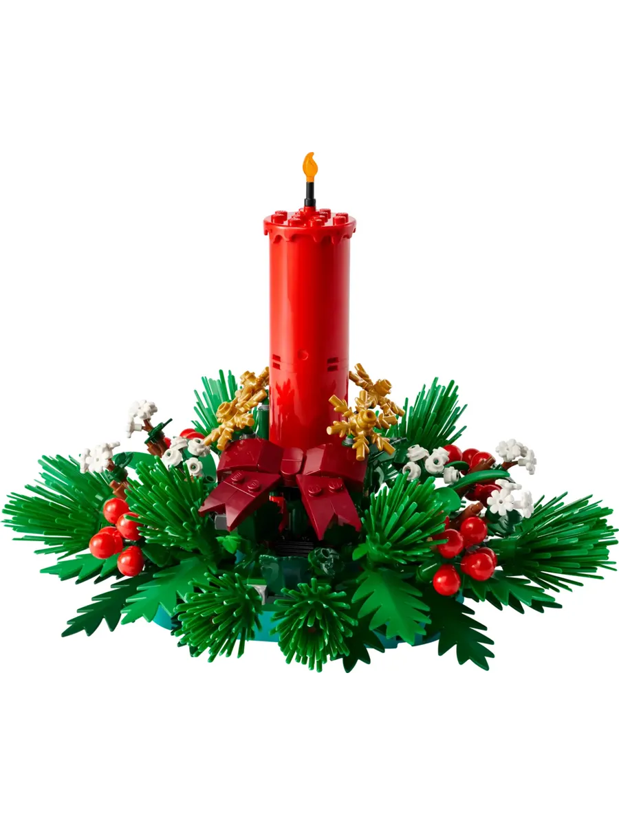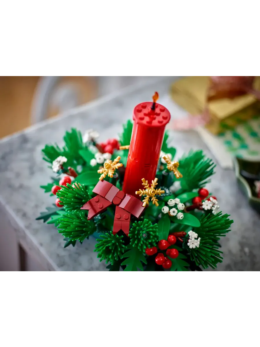 В центре рождественского набора LEGO красная свеча, окружённая красными ягодами, золотыми звёздами и зелёной листвой. Праздничную инсталляцию можно построить всей группой, что поможет семьям и друзьям сблизиться в этот праздничный сезон. После сборки композицию можно поставить в центр стола во время праздничных застолий и посиделок.