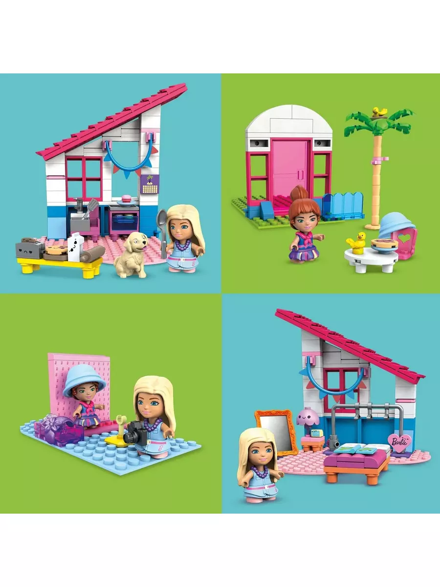 В Домике Малибу вас ждут 2 микро-куклы Барби, 3 питомца, 303 детали и 5 оснований
