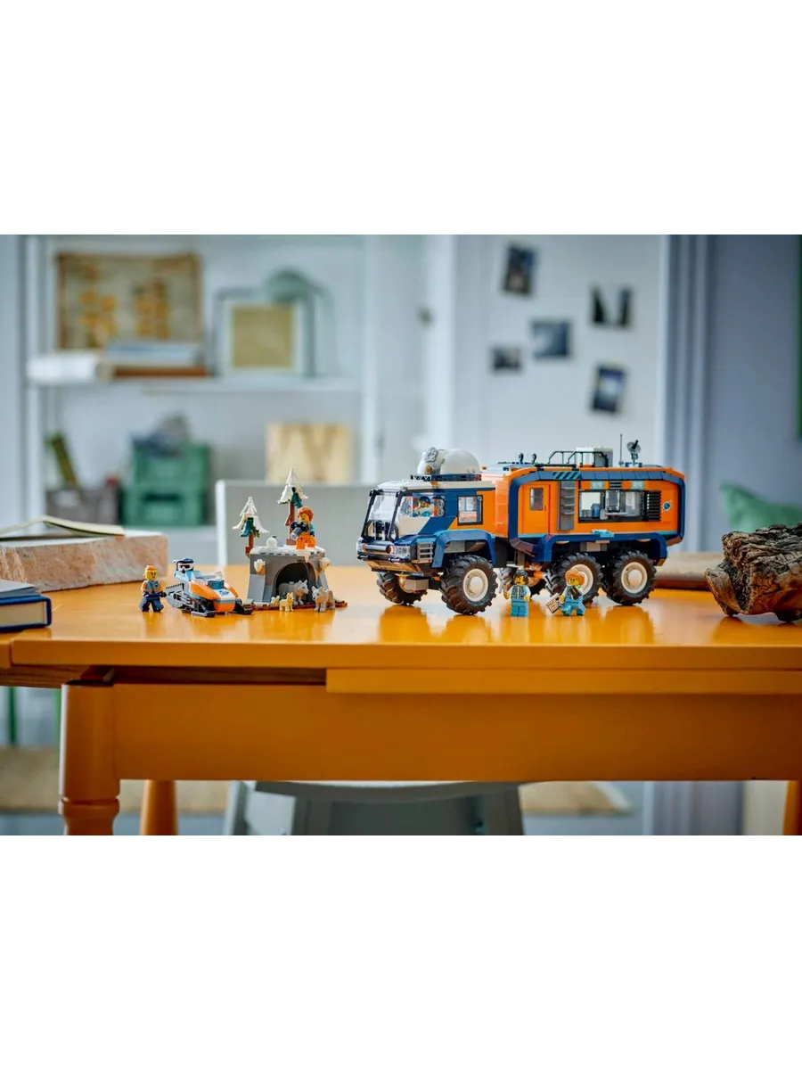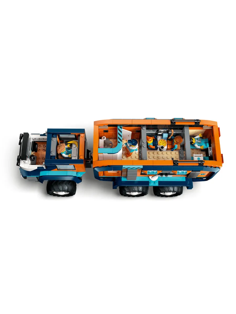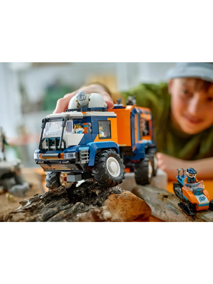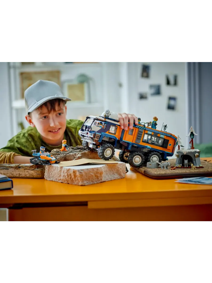 В этом реалистичном игровом наборе есть шарнирный игрушечный грузовик с 6-колесной подвеской, шинами с глубоким протектором и вращающейся обсерваторией на крыше, а также интересные детали интерьера, включая кабину водителя, лабораторию и уютную гостиную с ванной, кухней и спальней. Дети также получат игрушечный снегоход и набор «Арктическая пещера», а также 5 минифигурок исследователей и 3 фигурки арктических волков, в том числе щенка, для творческих игр.