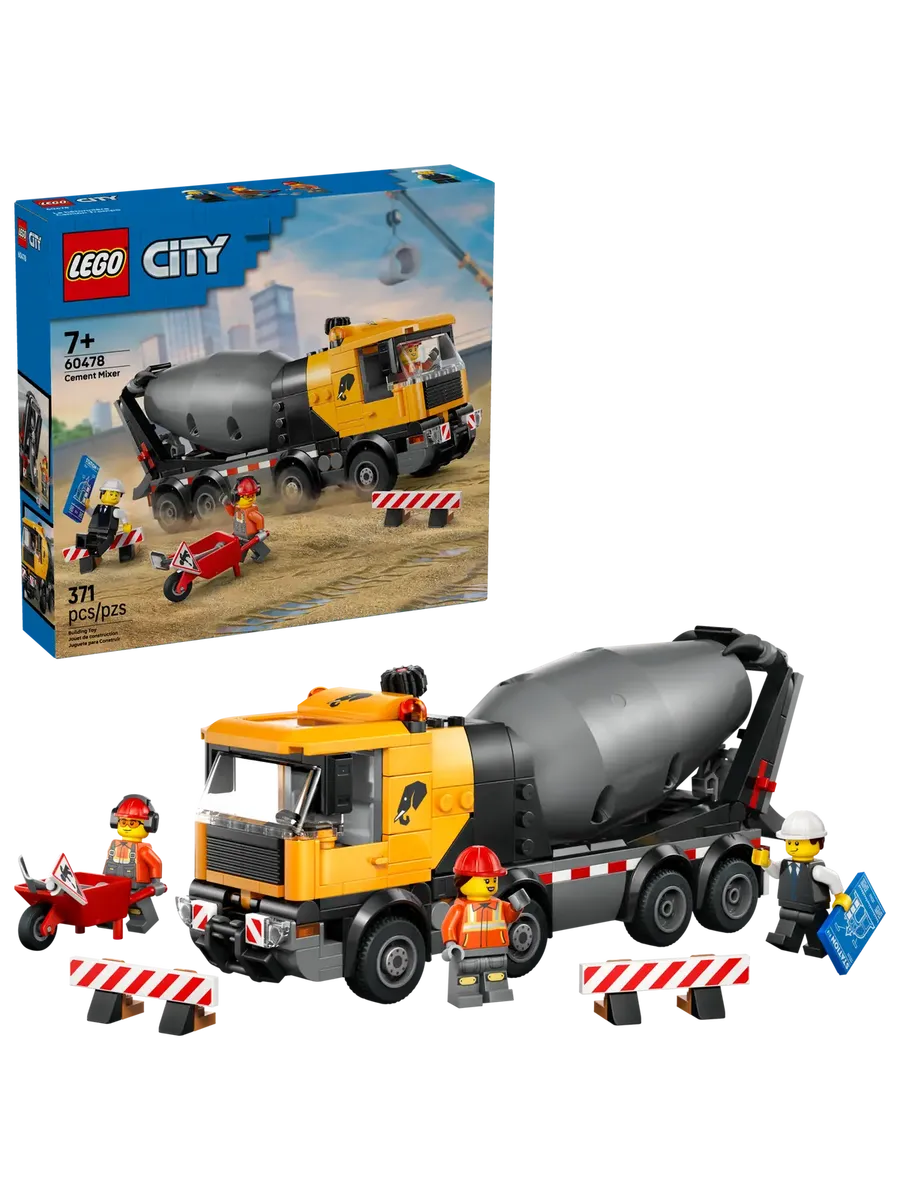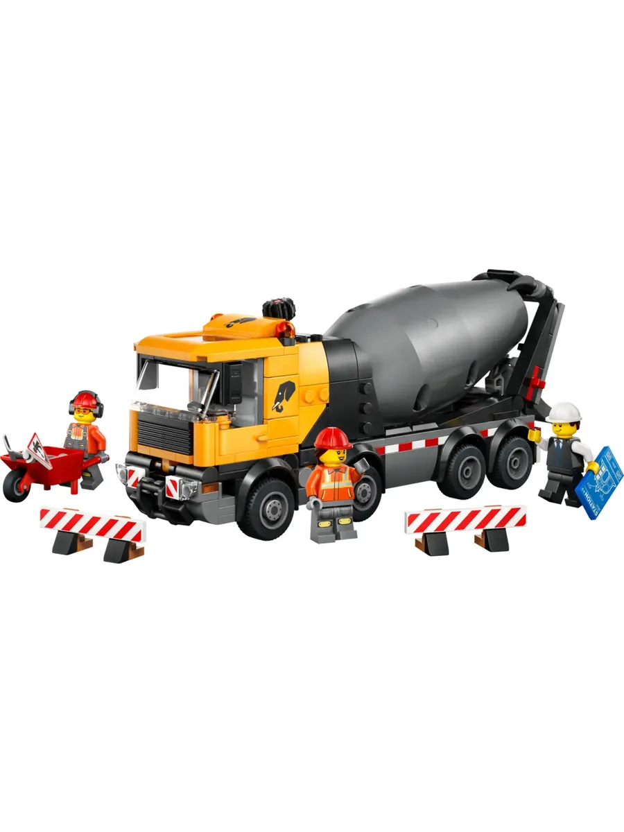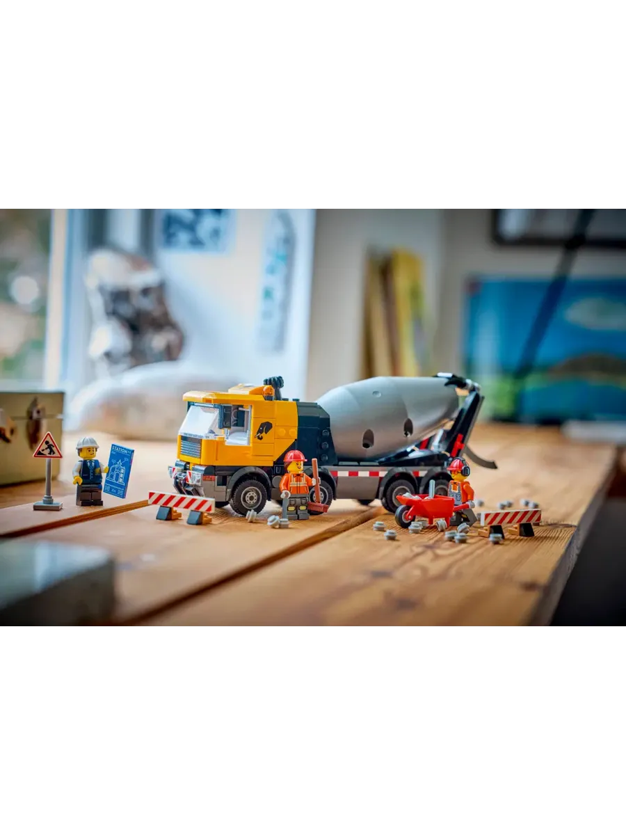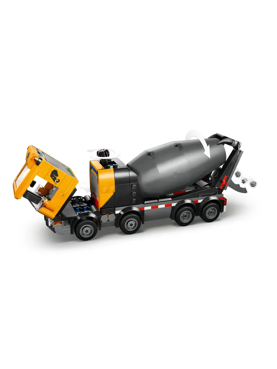 Любителям конструкторов понравится набор для сборки модели LEGO City «Бетономешалка» (60478) для детей от 7 лет. Эта детально проработанная автобетономешалка с 8 резиновыми шинами оснащена большим барабаном с системой шнеков Архимеда. Дети могут поворачивать диск, чтобы смешивать и подавать цемент LEGO по регулируемому желобу, как при настоящей заливке цемента. У этого большого игрушечного грузовика также есть кабина водителя, которая наклоняется, чтобы обеспечить доступ к двигателю. В набор входят тачка, дорожный знак и 2 барьера, а также минифигурки водителя, строителя и архитектора для творческих игр.
