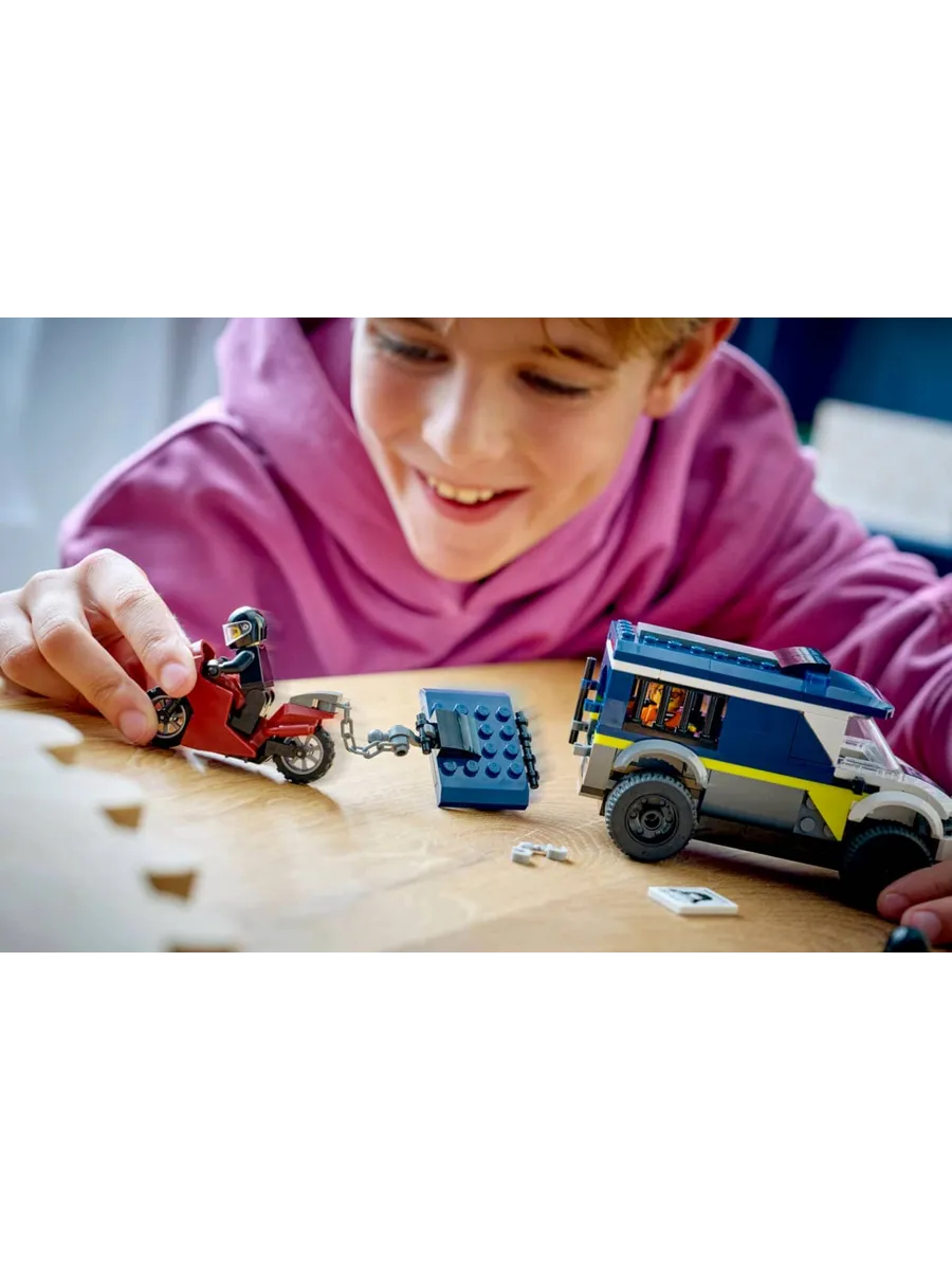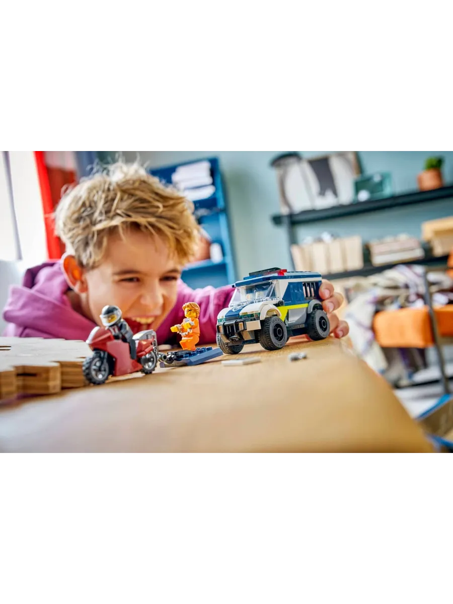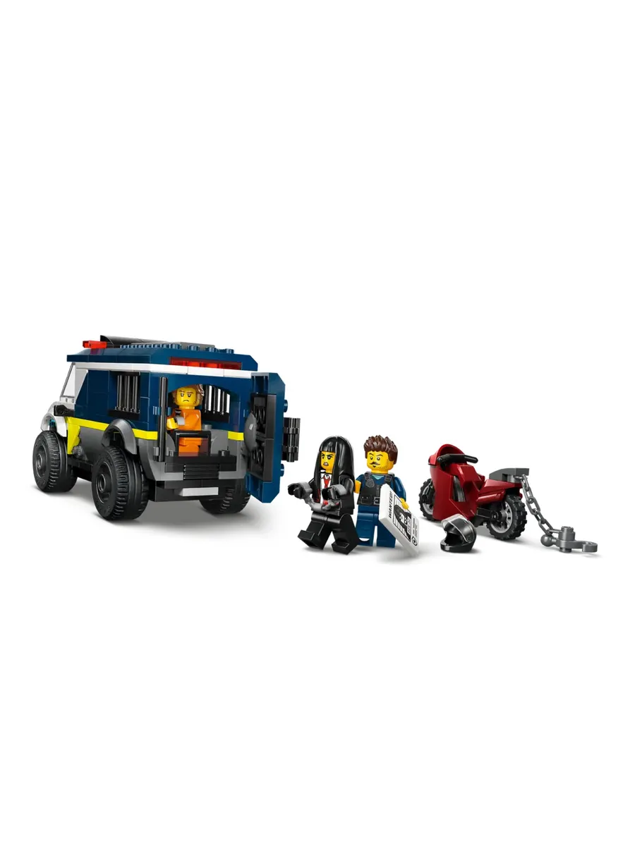 Модель полицейского фургона включает в себя детально проработанную кабину водителя и тюремную камеру, в которой могут разместиться 2 преступника. С помощью игрушечного мотоцикла с цепью и крюком дети могут открыть дверь камеры. Добавьте полицейского и 2 минифигурки преступников, чтобы разыграть эпическую сцену побега из тюрьмы.