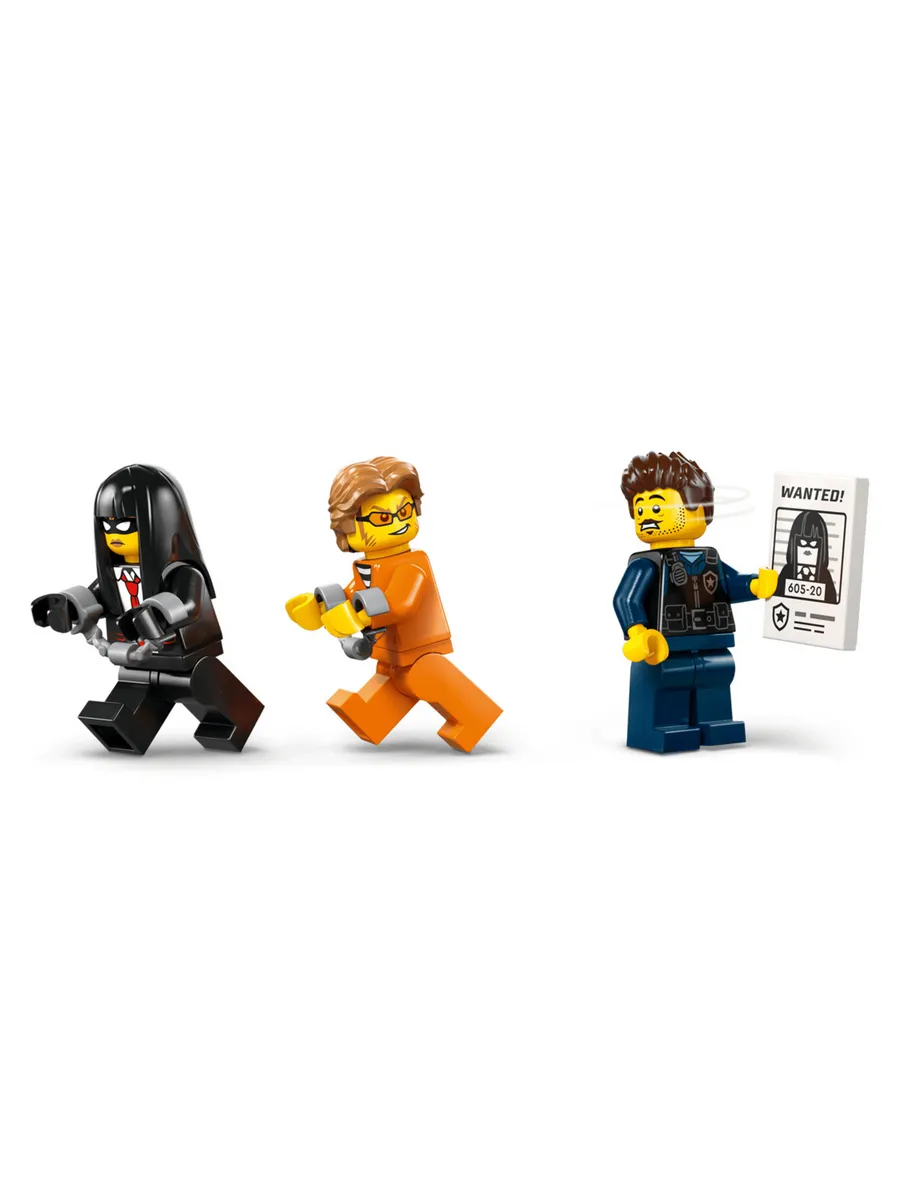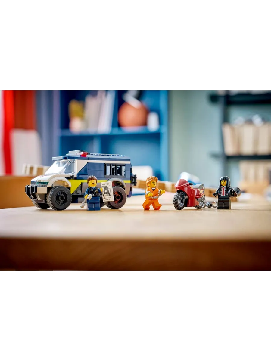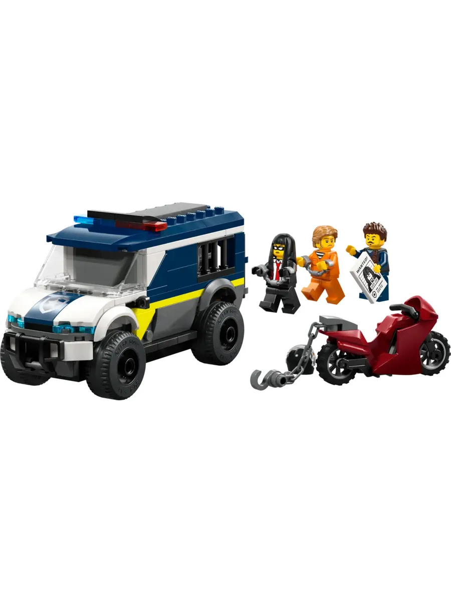Модель полицейского фургона включает в себя детально проработанную кабину водителя и тюремную камеру, в которой могут разместиться 2 преступника. С помощью игрушечного мотоцикла с цепью и крюком дети могут открыть дверь камеры. Добавьте полицейского и 2 минифигурки преступников, чтобы разыграть эпическую сцену побега из тюрьмы.