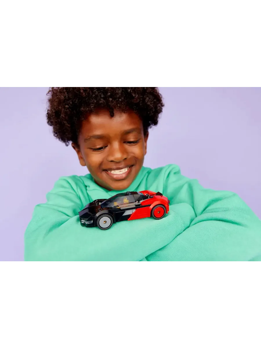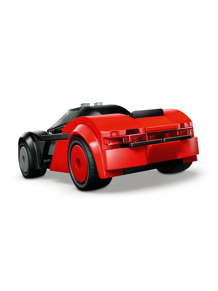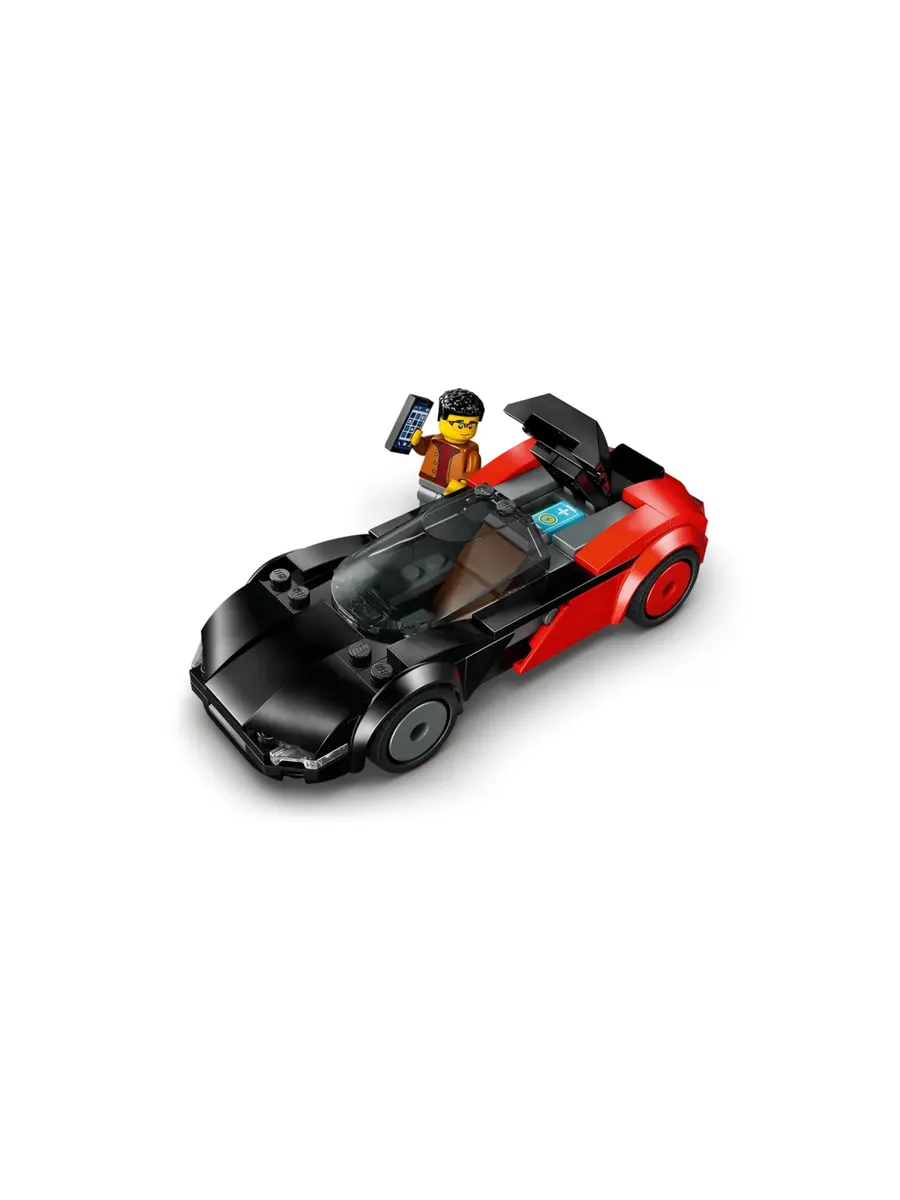 Поднимите задний люк маленького черно-красного спортивного автомобиля, чтобы получить доступ к игрушечному аккумулятору, и посадите минифигурку водителя за руль на несколько часов.