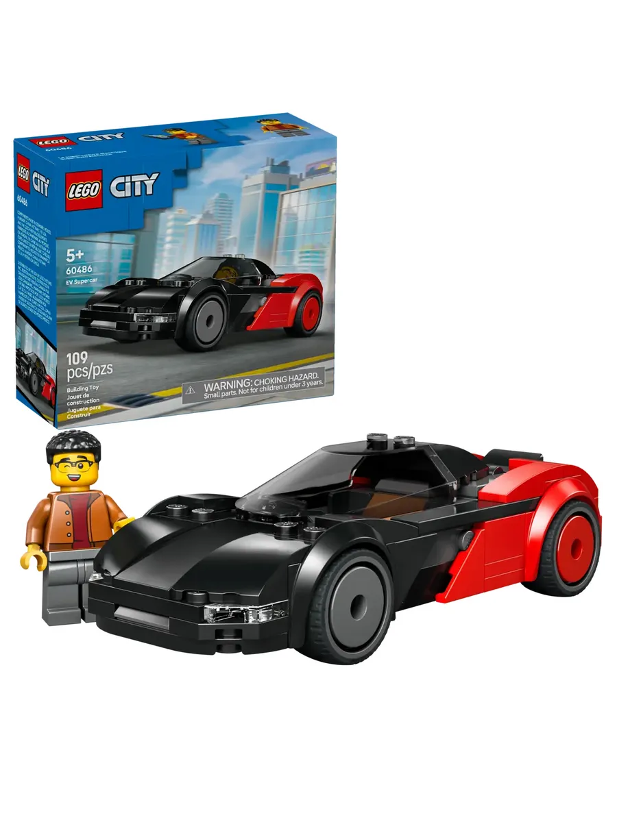 Подарите юному любителю электромобилей конструктор LEGO City EV Supercar (60486) для детей от 5 лет. Эта простая в сборке игрушка-электромобиль оснащена реалистичными деталями для игр и демонстрации, в том числе элегантным аэродинамическим кузовом в яркой красно-чёрной цветовой гамме, низкопрофильными резиновыми шинами, задней фарой и тонированным навесом кабины. Дети могут открыть задний люк, чтобы добраться до игрушечного аккумулятора, и посадить минифигурку водителя за руль, чтобы часами играть в ролевые игры и придумывать истории. Этот небольшой игровой набор с машинкой станет отличным подарком на день рождения или сюрпризом для мальчиков, девочек и детей, которые любят современные электромобили и конструкторы LEGO. Добавьте этот набор к другим (продаются отдельно) из серии LEGO City, чтобы было ещё интереснее. Дети в возрасте от 5 лет могут насладиться динамичными гонками с имитацией электрического спортивного автомобиля LEGO City EV Supercar (60486), включая минифигурку водителя со смартфоном.