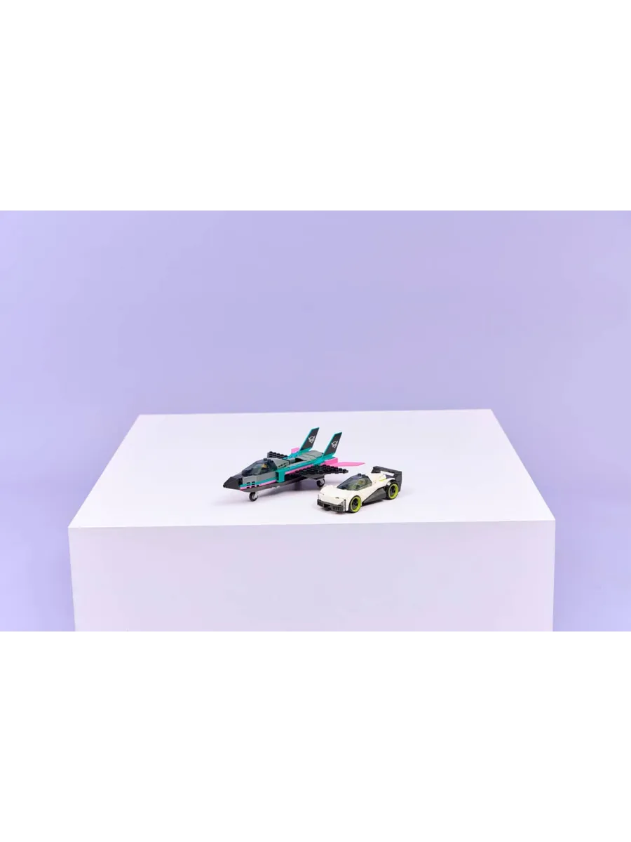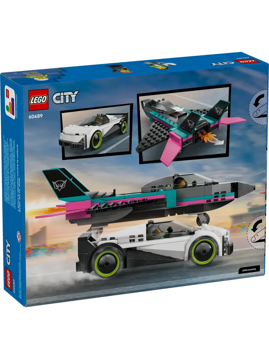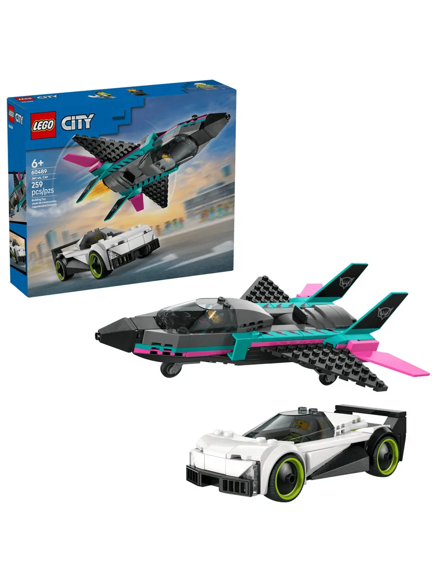 Этот двойной игровой набор LEGO City Jet vs. Car (60489) включает в себя изящный суперкар и сверхзвуковой реактивный самолет для увлекательных гонок.