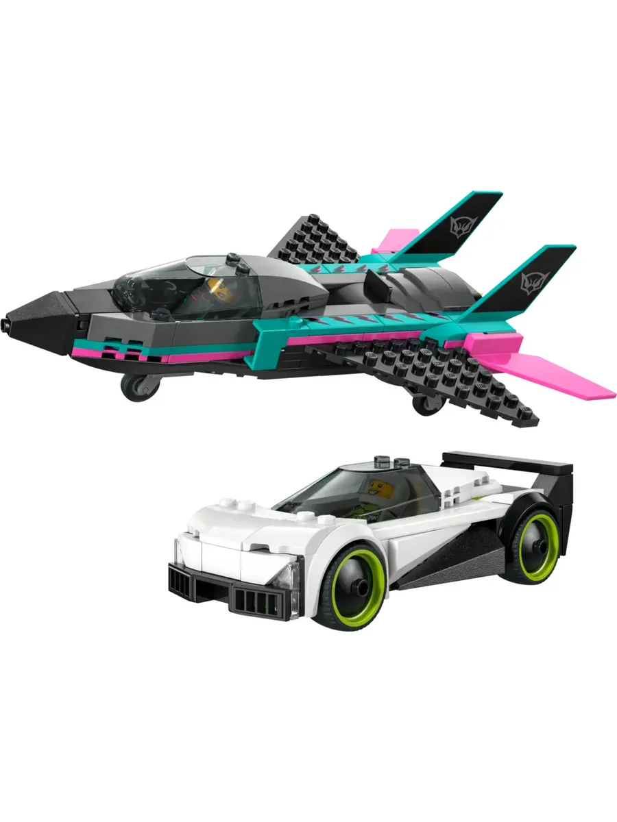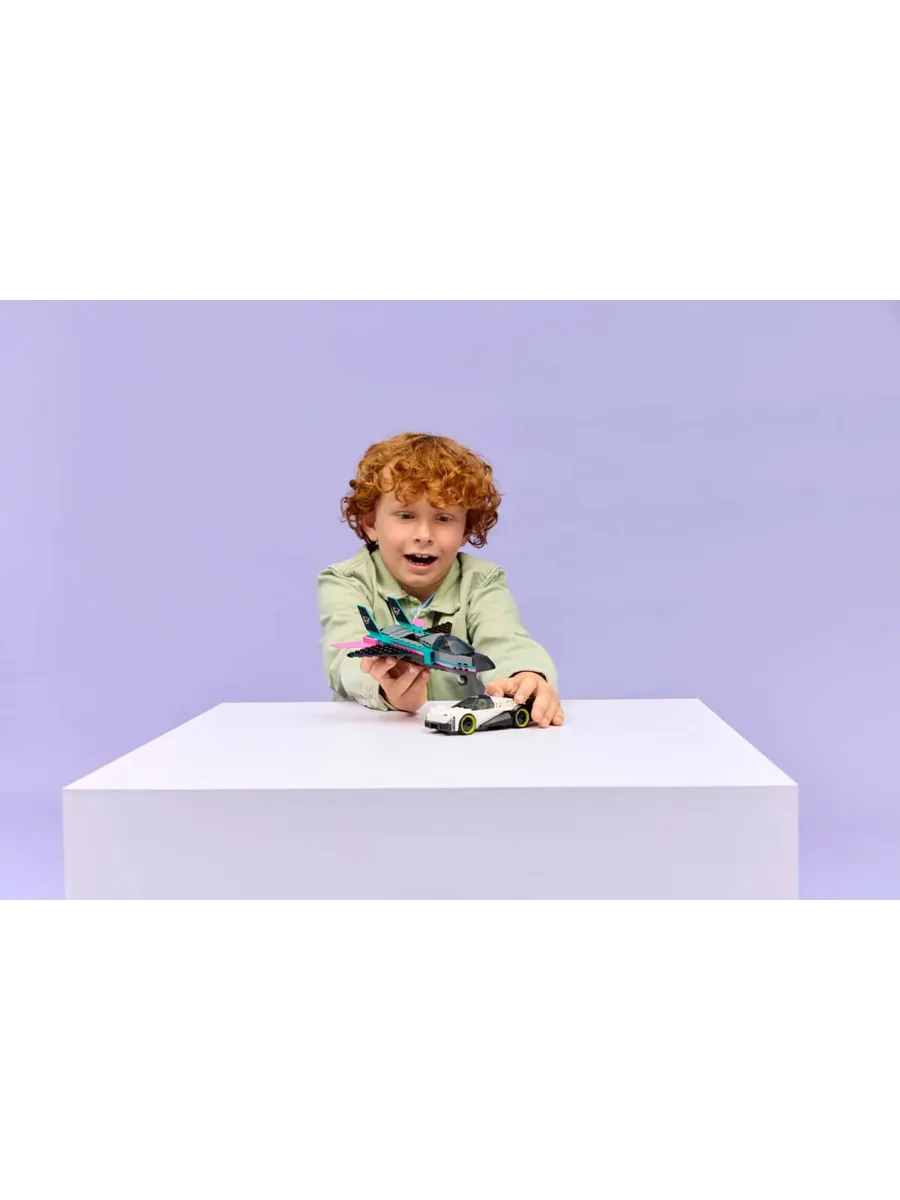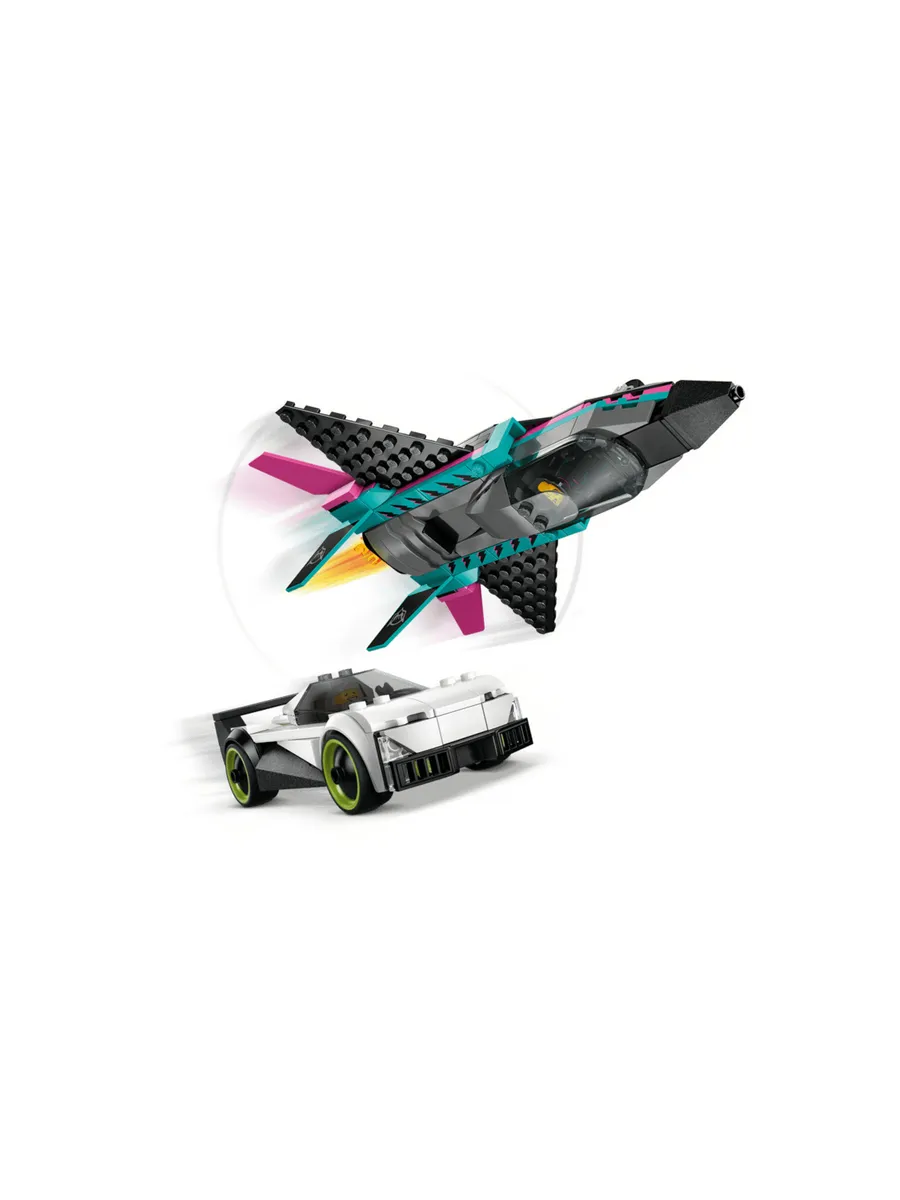Этот двойной игровой набор LEGO City Jet vs. Car (60489) включает в себя изящный суперкар и сверхзвуковой реактивный самолет для увлекательных гонок.