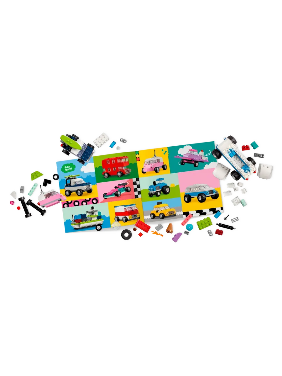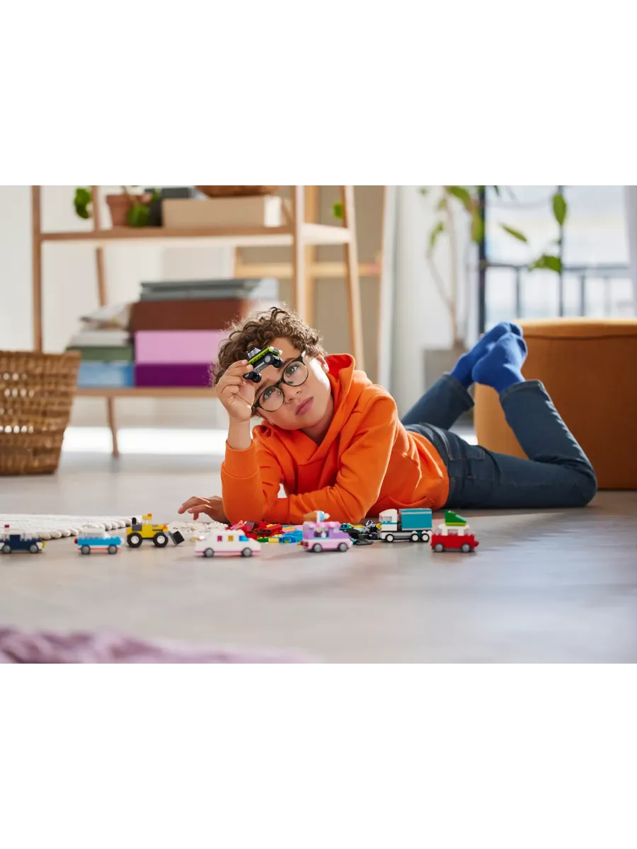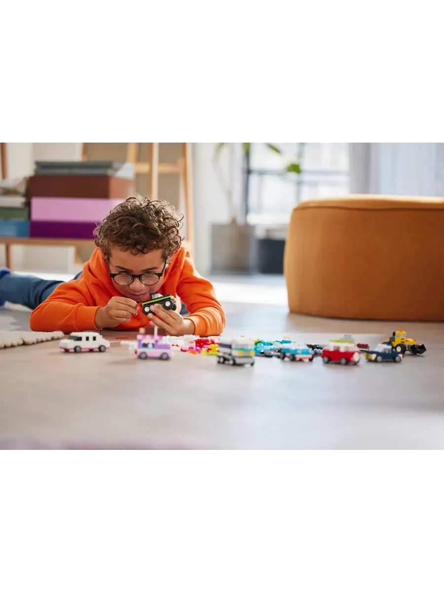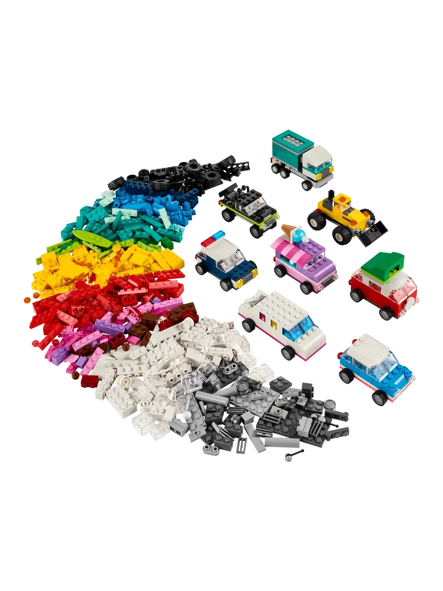 С помощью 900 строительных кубиков, специальных деталей и 52 колёс, а также простых инструкций дети смогут собрать полицейскую машину, фургон для мороженого, квадроцикл, фронтальный погрузчик, грузовик, универсал, внедорожник и игрушечный лимузин. Затем, используя идеи для различных конструкций, крутые детали и красочные украшения, дети смогут по-новому преобразить свои транспортные средства. По мере развития навыков творческого конструирования дети смогут создавать собственные проекты. В набор включены 10 вдохновляющих идей, которые помогут начать увлекательное конструирование. Инструкции также доступны в приложении LEGO Builder, которое позволяет детям увеличивать масштаб, поворачивать модели и отслеживать прогресс.