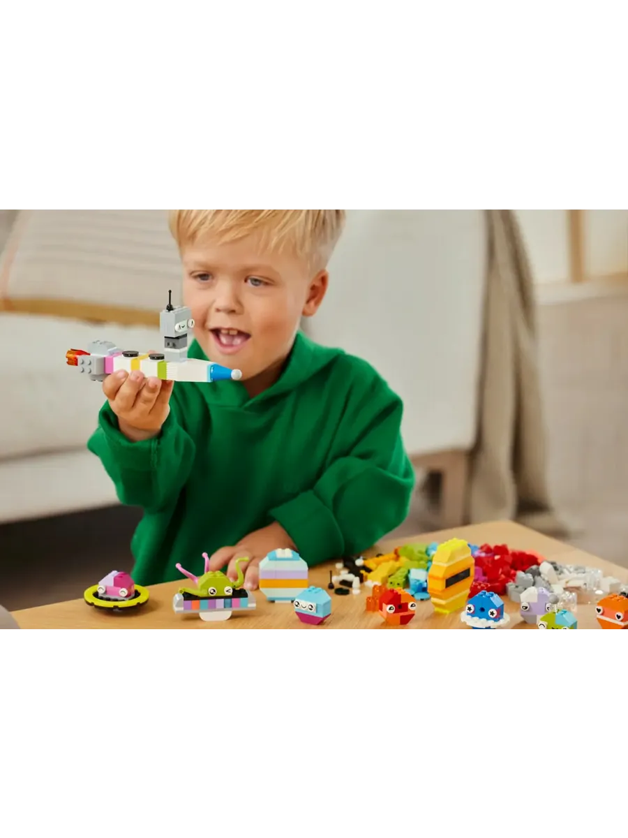 Вдохновляйте юных конструкторов — специальные детали, в том числе альтернативные формы, глаза, выражения лиц и светящиеся в темноте кирпичи, побуждают детей персонализировать свои творения