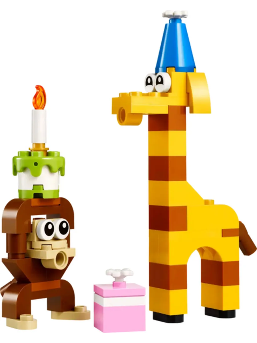 Добавьте веселья на празднование дня рождения с помощью милого игрового набора LEGO "Животные на Дне Рождения" с обезьянкой, которая держит над головой праздничный торт, жирафом в праздничной шляпе и подарочной коробкой. Конструктор подарит вашему ребенку увлекательное времяпрепровождение и поможет развить воображение. Конструктор LEGO совместим с другими наборами серии, что открывает безграничные возможности для творчества. Яркие детали из прочного ABS-пластика безопасны для детей и легко соединяются, что делает сборку увлекательной и доступной для юных строителей в возрасте от 4 до 7 лет.