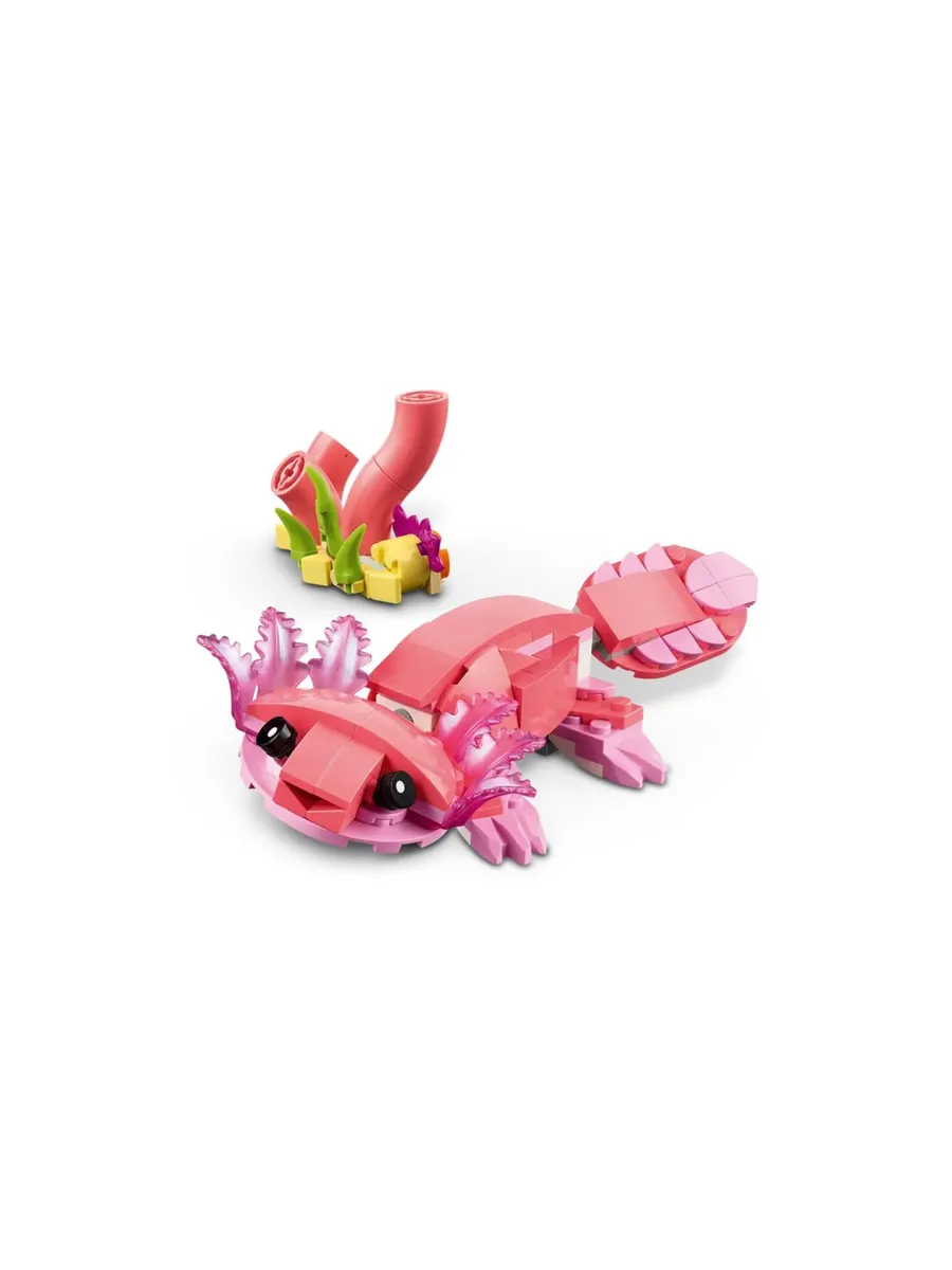 Этот набор LEGO предлагает детям 3 варианта сборки из одних и тех же деталей: розовую игрушку-фламинго с подвижной головой на подставке, покрытой растениями, подвижную розовую игрушку-какаду, которая может поворачивать голову на 360 градусов, или очаровательную подвижную розовую игрушку-аксолотля с подводными растениями. Все 3 милые игрушки-трансформеры LEGO в виде животных станут забавными подарками для детей.