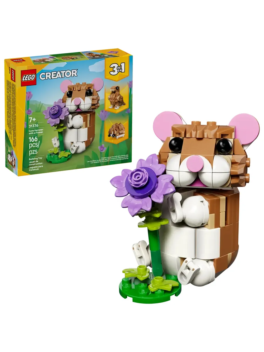 Девочки и мальчики от 7 лет, которые любят животных, могут разыграть забавные истории с помощью конструктора LEGO Creator «Милый хомячок с цветком» 3 в 1 (31376). Этот очаровательный набор для игр с животными предлагает 3 варианта сборки из одного и того же набора кубиков. Дети могут собрать игрушечного хомячка с подвижной головой и передними лапками и фиолетовым цветком. Они также могут превратить его в ёжика с цветком или в подвижного орла с яйцом в гнезде. Когда строительство и игры закончатся, каждую модель можно будет поставить на полку или стол в качестве милого декора.