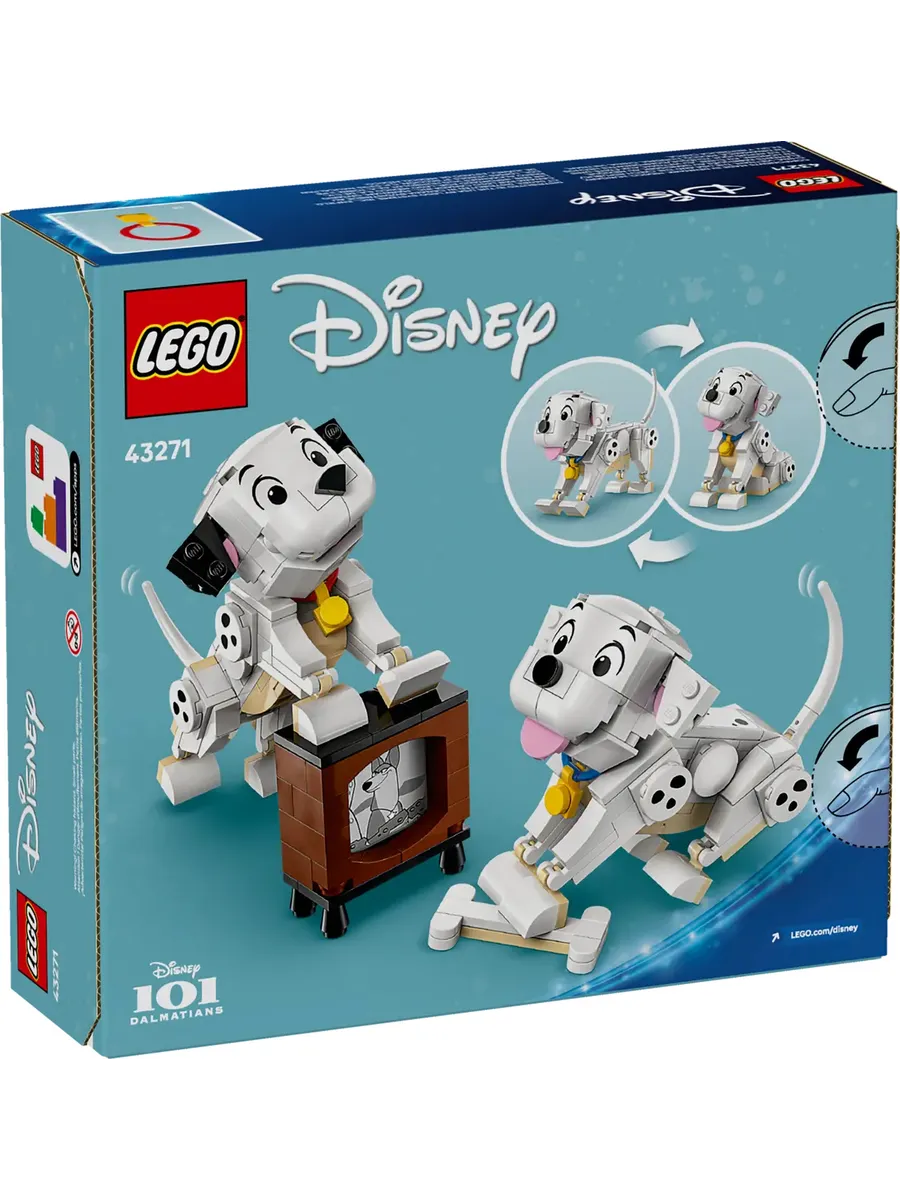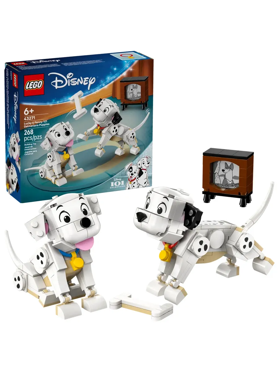 Порадуйте детей или любителей животных в возрасте от 6 лет и старше набором «Щенки Лаки и Пенни из 101 далматинца» (43271) из этой конструктивной игрушки LEGO ǀ Disney. В набор входят 2 персонажа-щенка из классического диснеевского мультфильма «101 далматинец», а также игрушечная кость из кирпичиков и маленький телевизор. У персонажей-щенков LEGO ǀ Disney подвижные головы, ноги и хвосты, и их можно располагать в разных позах.