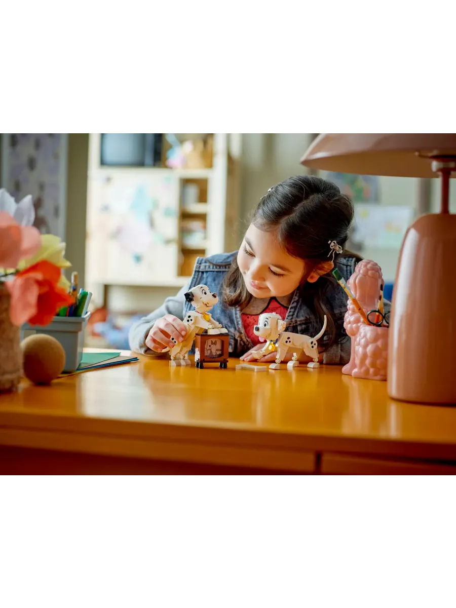 Далматинские щенки повсюду — эта детская строительная игрушка включает в себя персонажей LEGO ǀ Disney из классического фильма «101 далматинец» — Лаки и Пенни, а также кирпичную кость и маленький телевизор с экраном.