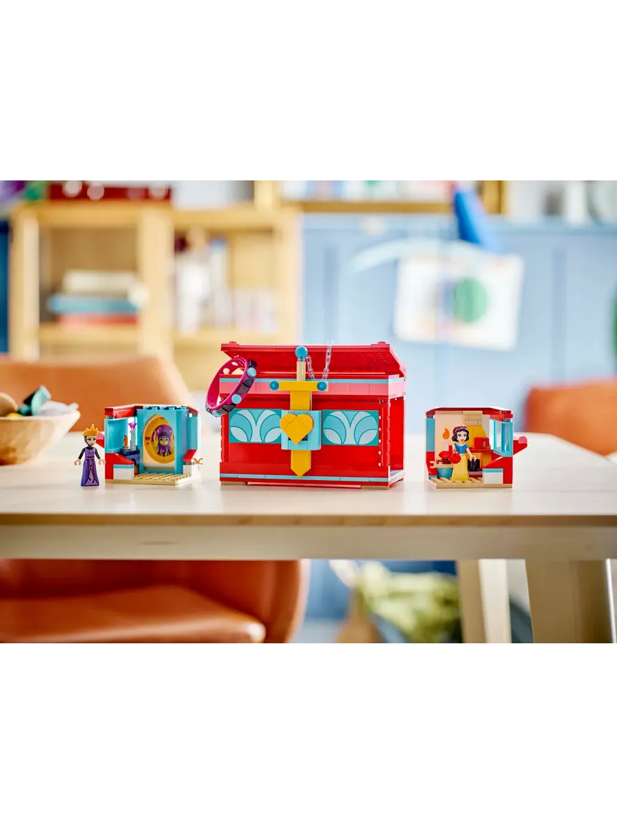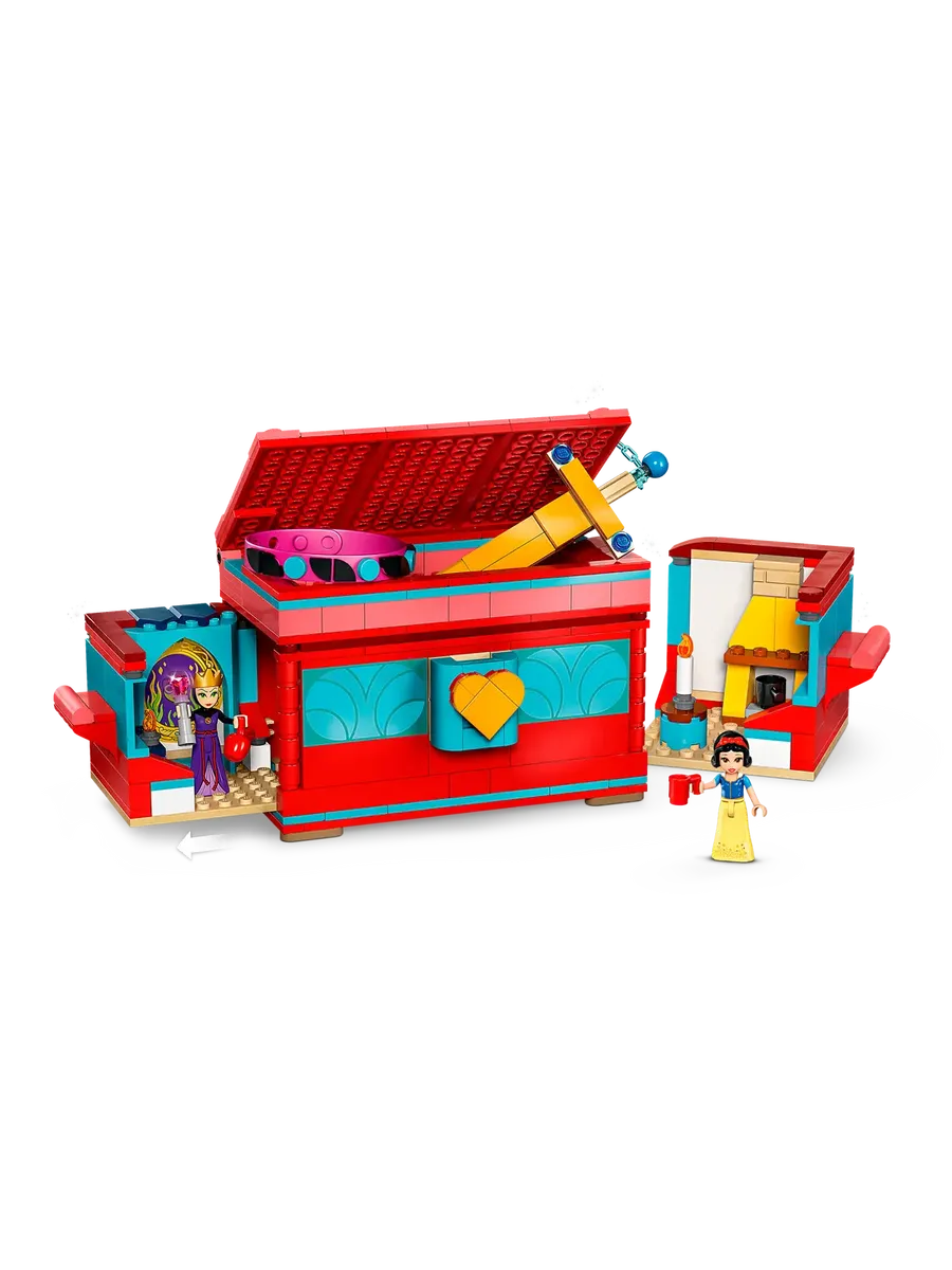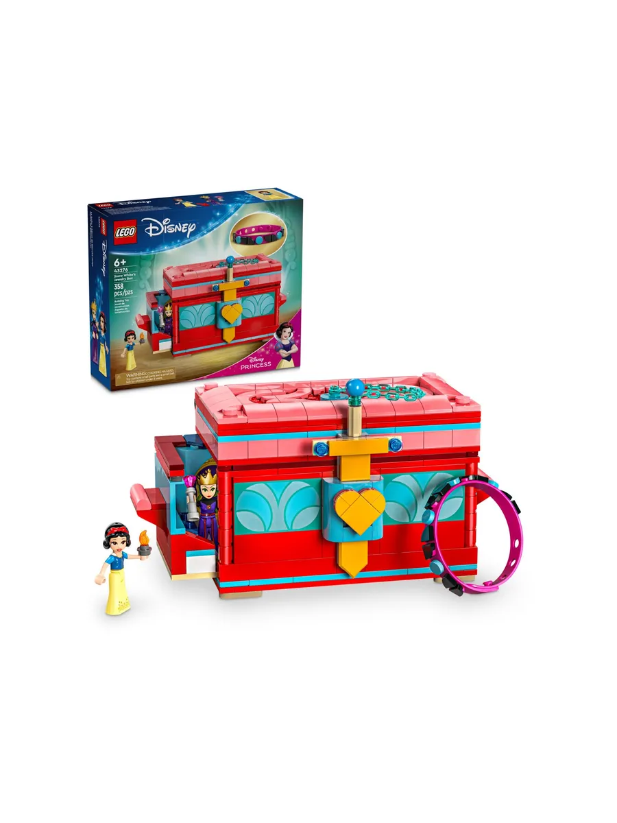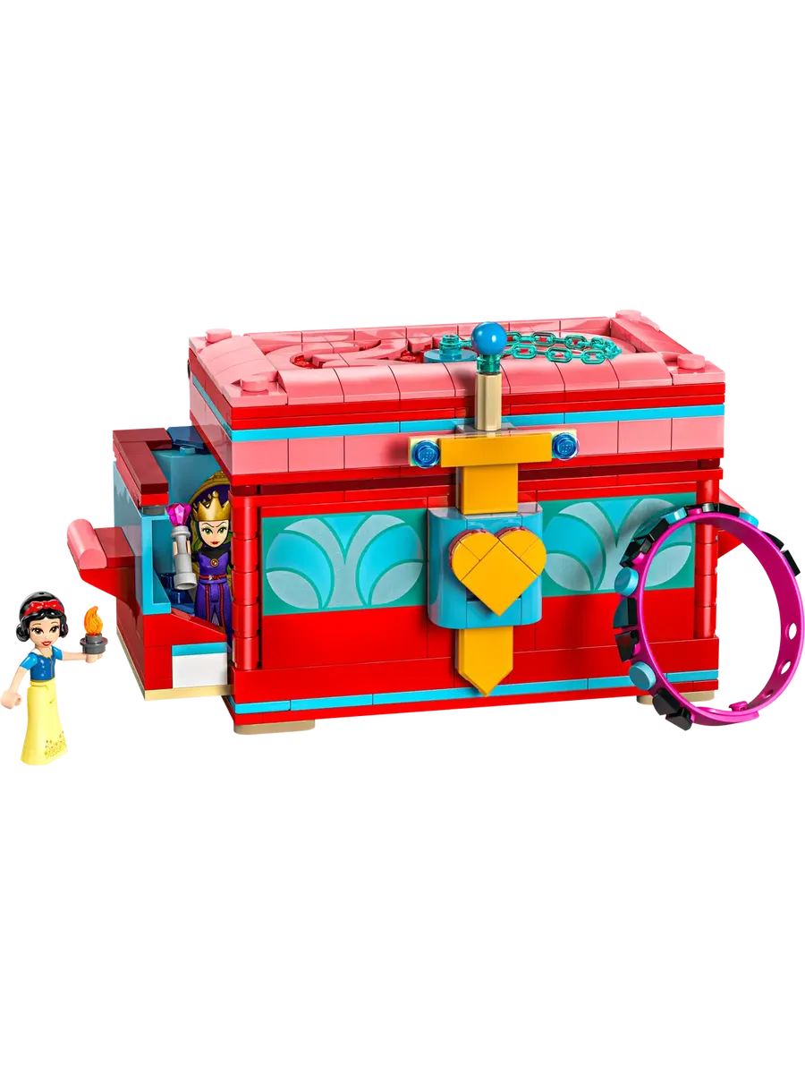 Шкатулка для украшений — включает в себя сборную игрушку-шкатулку для украшений с запирающейся крышкой, браслет, множество декоративных элементов и фигурки Белоснежки и Злой Королевы LEGO Disney.