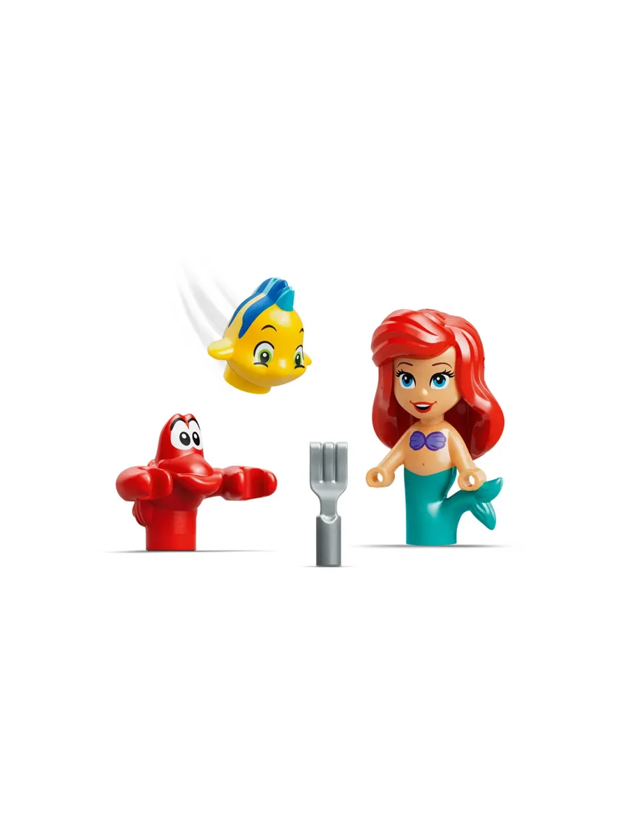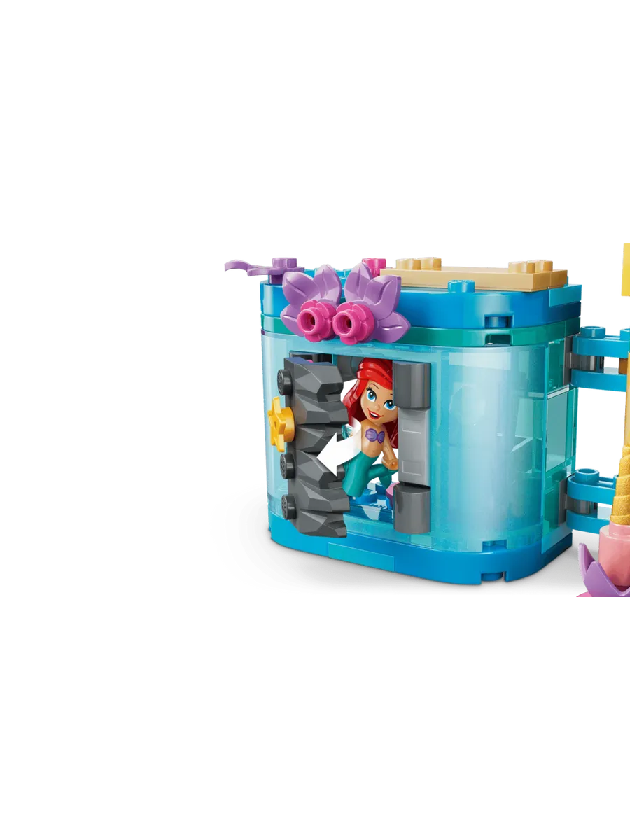 Волшебный мини-дворец Ариэль (43285) включает в себя персонажей LEGO Диснея Ариэль, Камбалу и Себастьяна, маленькую лодку, запирающийся мини-дворец и грот. Разблокируйте набор для постройки дворца ключом, чтобы открыть модель; с каждой стороны есть открывающиеся дверцы, лодка съемная, и дети могут прикрепить дельфина к коляске.