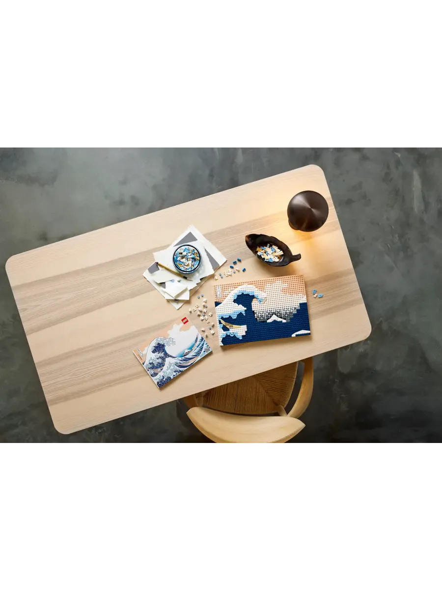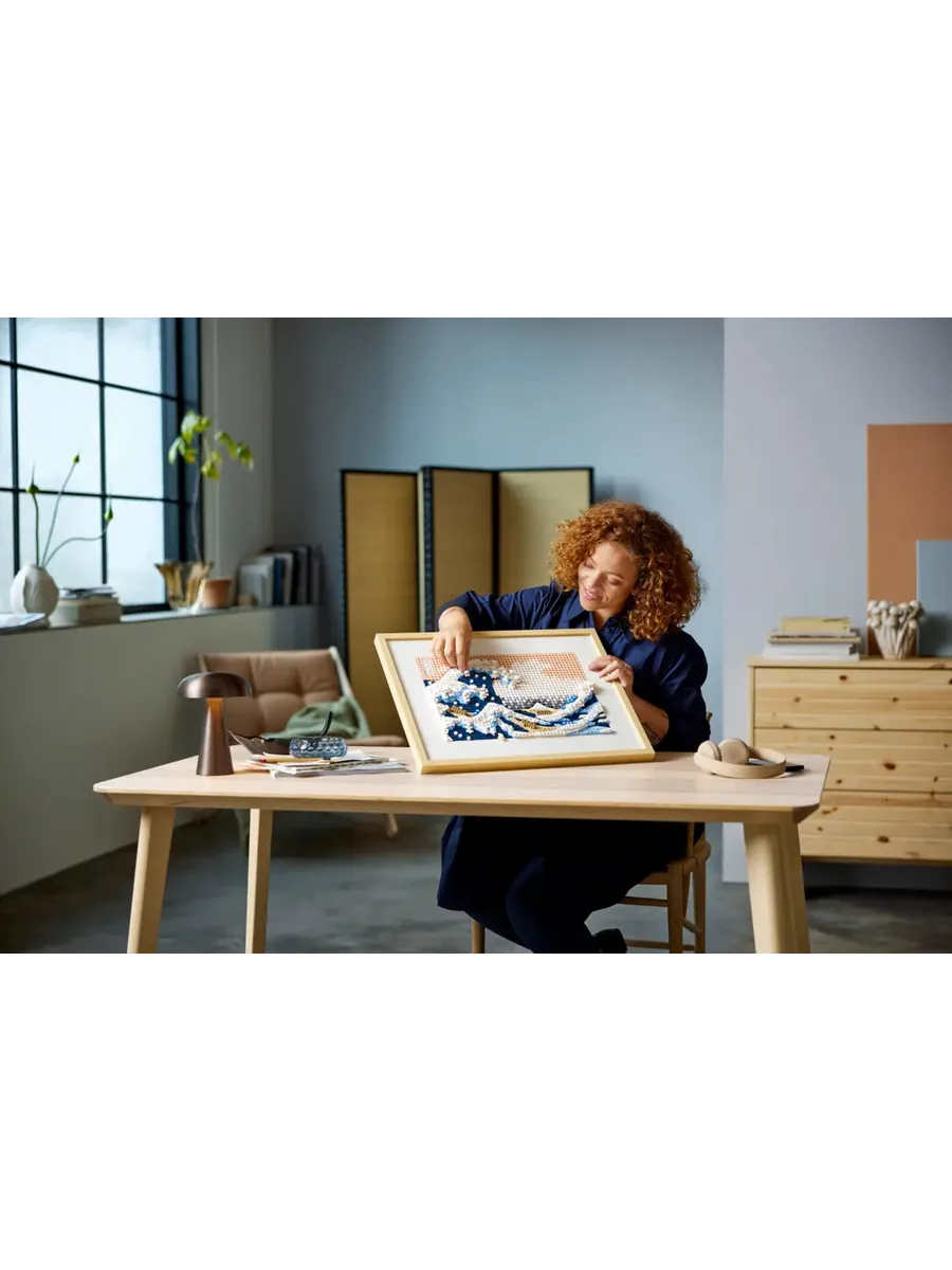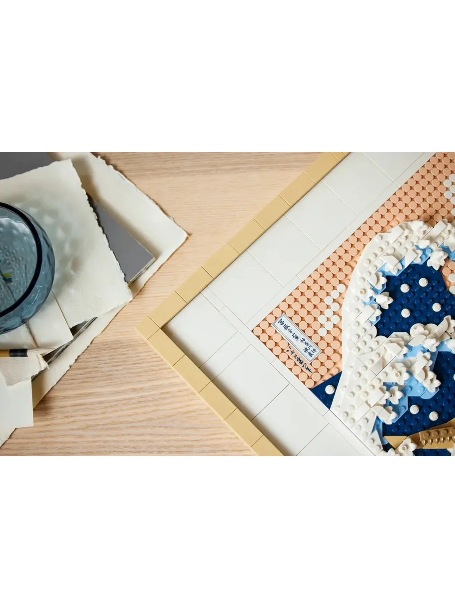 Потрясающий экспонат — набор LEGO для взрослых, состоящий из 1810 деталей, 6 холщовых пластин, 2 элементов для подвешивания, разделителя для кирпичей и декоративной плитки с подписью Хокусая.