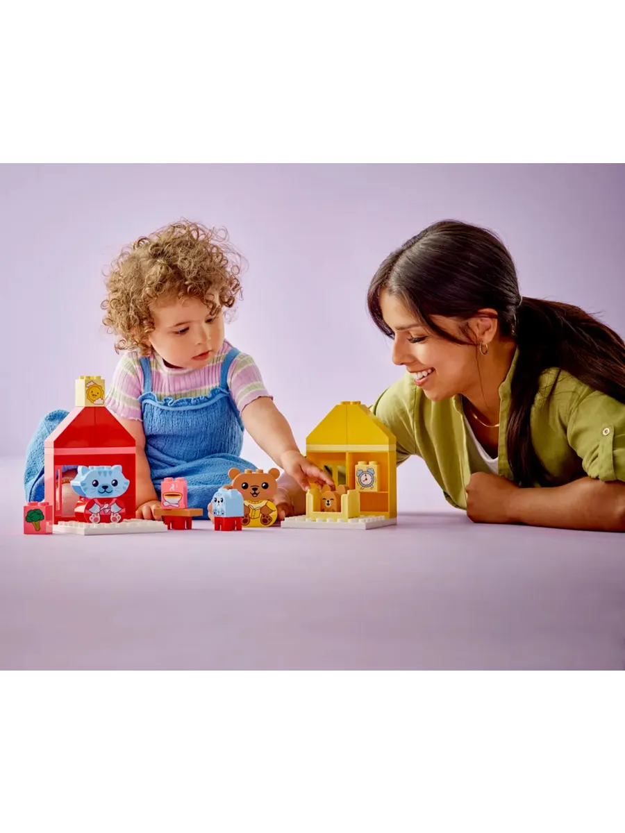 Наборы LEGO DUPLO особенно хорошо подходят для обучения в процессе игры. Во время увлекательных интерактивных ролевых игр родители могут использовать фигурки из конструктора, чтобы объяснить малышам, насколько важны повседневные дела. Малыши развивают мелкую моторику, складывая разноцветные кубики в 2 игрушечных домика. Обе повседневные рутины изображены с помощью камней, сочетающихся по цвету, чтобы строительство превратилось в детскую игру.