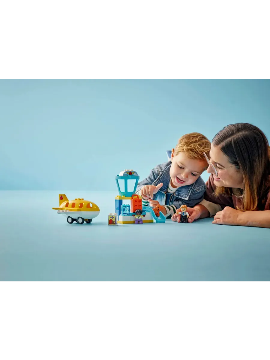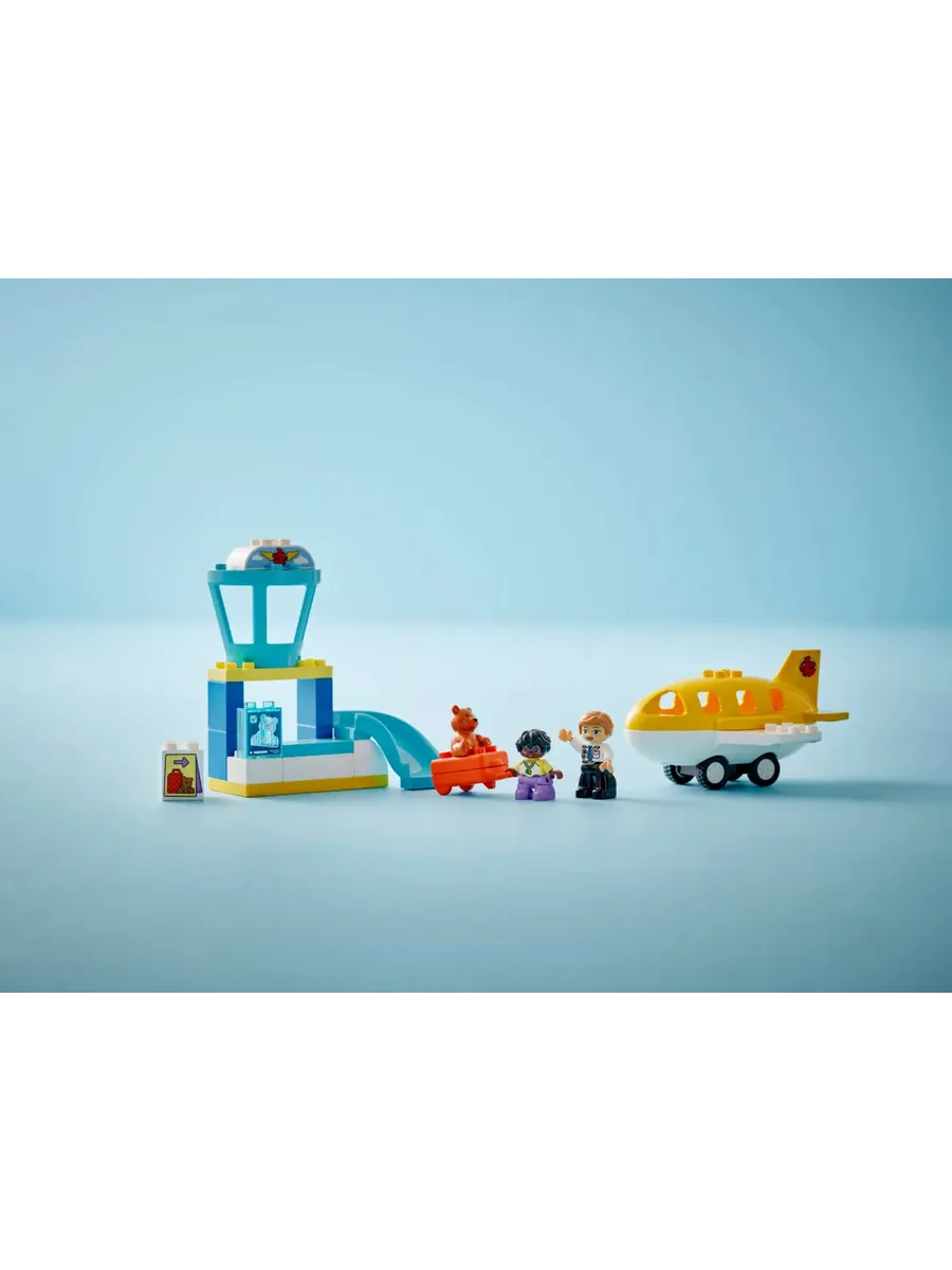Этот игровой набор LEGO DUPLO «Аэропорт» включает в себя стойку регистрации, где малыши могут играть в «сканирование» чемодана и его спуск по жёлобу, диспетчерскую вышку и подвижную игрушку-самолёт со съёмной крышей, которая подходит для фигурок плюшевого мишки, ребёнка и пилота.