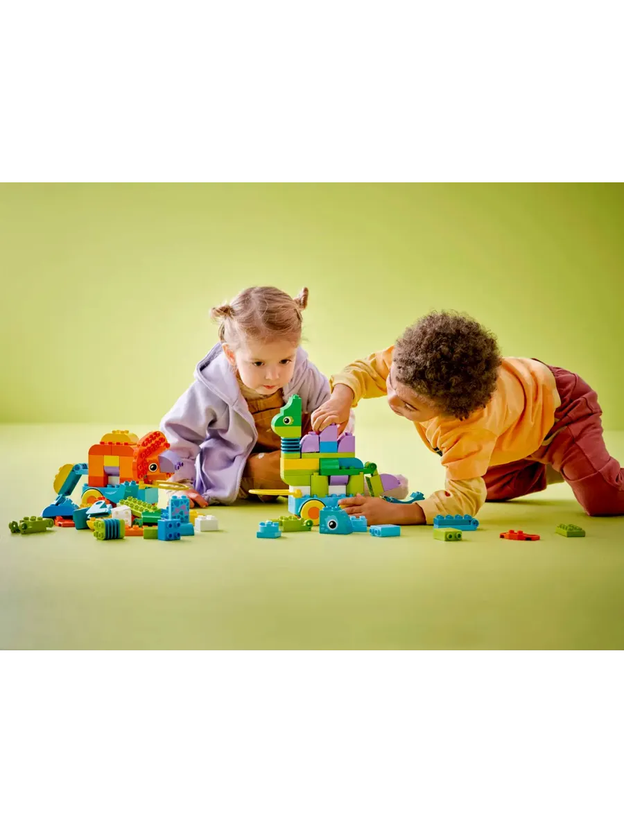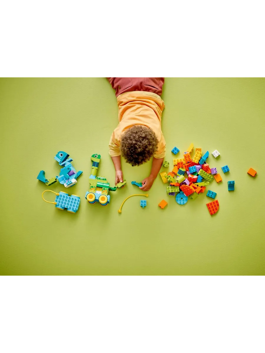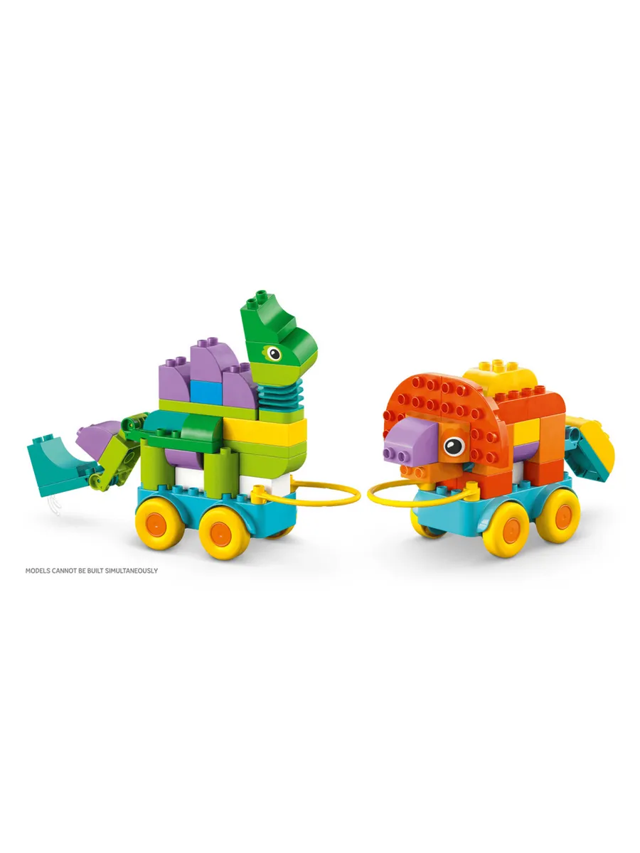 108 кубиков и деталей в этом наборе игрушек-животных LEGO DUPLO можно собрать тремя разными способами: в виде игрушек «Диплодок» и «Тираннозавр», «Трицератопс» и «Стегозавр» или «Птеранодон» и «Паразауролоф». Малыши могут сделать фигурки динозавров более интересными, добавив им подвижную шею, шарнирный хвост, машущие крылья или открывающуюся и закрывающуюся пасть. Дети дошкольного возраста собирают своих динозавров на колёсной базе, поэтому это отличный подарок для малышей, которые любят игровые наборы LEGO DUPLO с транспортными средствами.