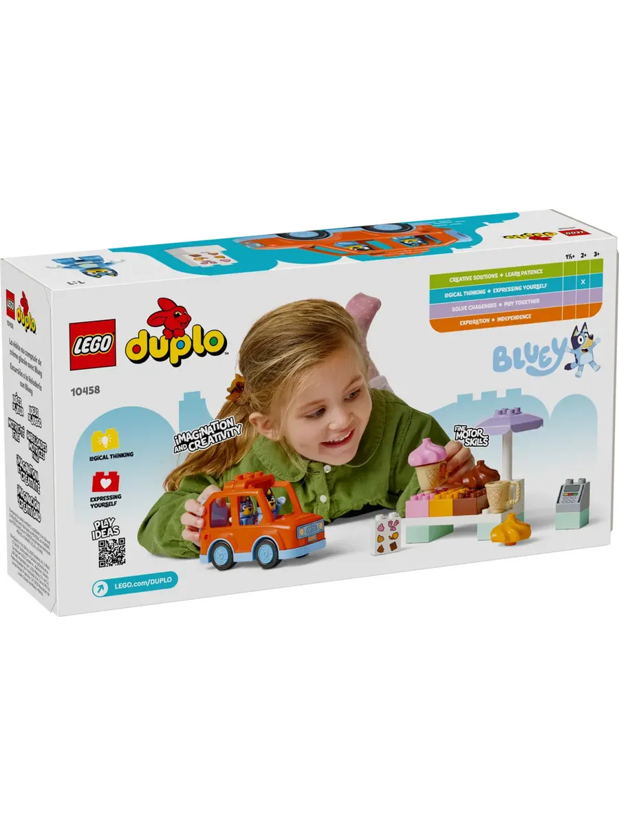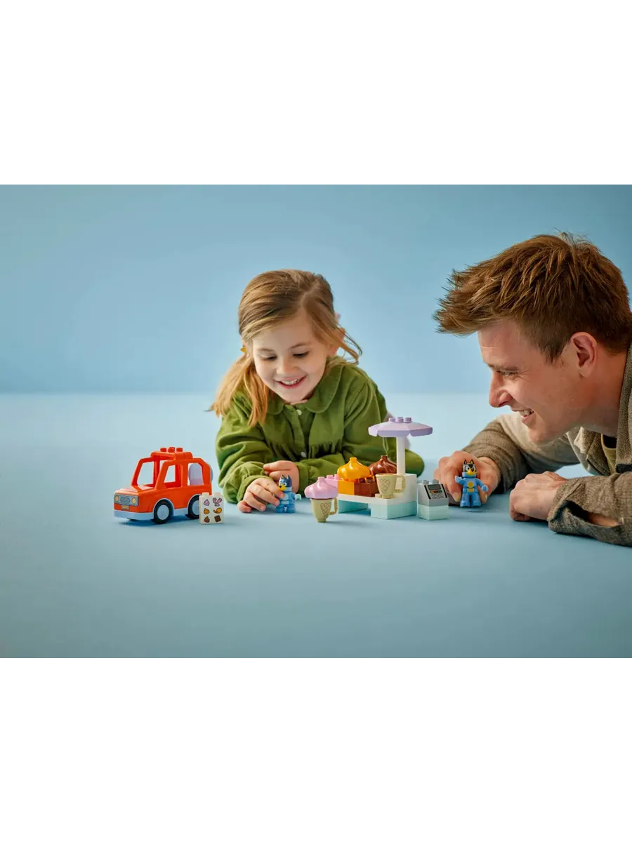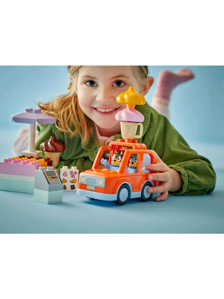 Малыши учатся распознавать числа, когда выбирают, сколько шариков они хотели бы получить, а затем складывают соответствующее количество камешков друг на друга. Когда они распределяют порционировщицы по соответствующим по цвету сортам мороженого, они учатся сортировать по цветам. А когда они вставляют «ледяные шарики» в вафли, у них развивается мелкая моторика. Наборы LEGO DUPLO Bluey позволяют дошкольникам и их семьям превращать повседневные занятия в увлекательные ролевые игры. При этом они также узнают, какие чувства вызывают у них эти занятия. Состоит из 22 деталей и включает в себя фигурки папы и Блуи, игрушечную машинку, автомат для кредитных карт, 3 формочки для льда, 2 вафли и карту для льда.