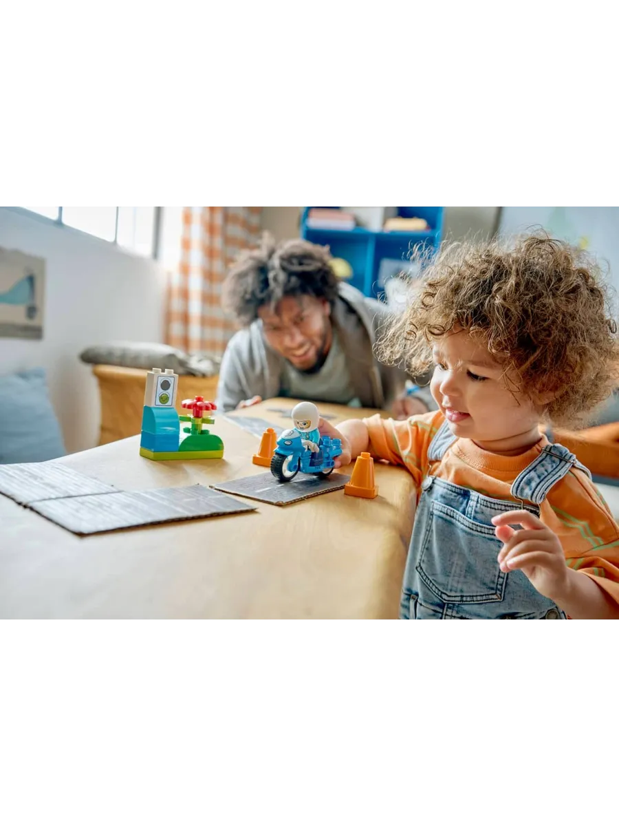 В набор входят фигурка полицейского, игрушечный светофор и 2 конуса. Наборы LEGO DUPLO с большими разноцветными кубиками, увлекательными сюжетами и разнообразными персонажами призваны удовлетворить естественное любопытство малышей и помочь им достичь основных этапов развития. Эта развивающая игрушка тренирует мелкую моторику: малыш сажает полицейского LEGO DUPLO на игрушечный мотоцикл и катает его вокруг конусов. С помощью игрушки «Светофор» родители могут научить маленьких участников дорожного движения, что красный цвет означает «стоп», а зеленый — «поехали!».