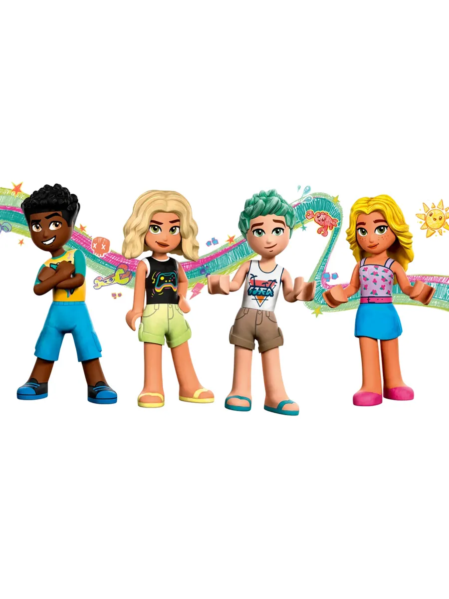 В набор входят персонажи LEGO Friends Зак, Нова, Дия и Чарли, а также альтернативные головы для Зака и Новы, чтобы дети могли менять выражение их лиц и рассказывать истории.