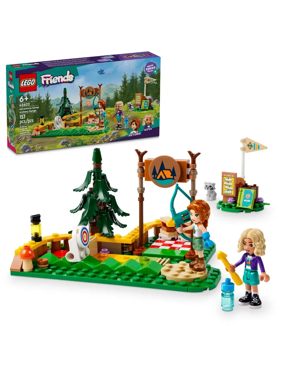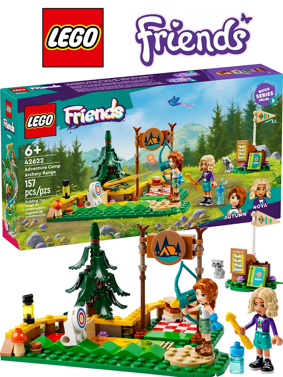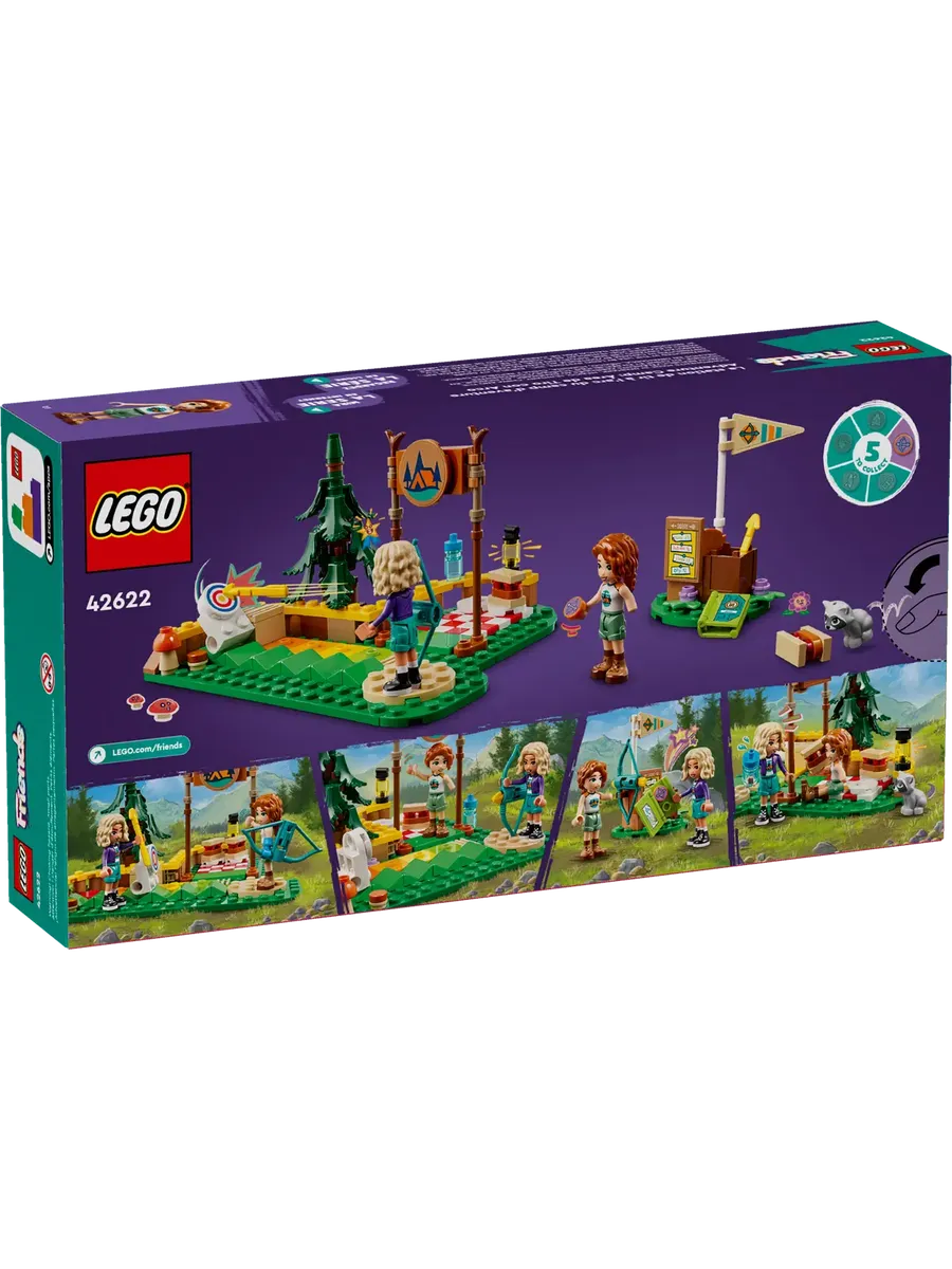 Конструктор LEGO «Приключенческий лагерь друзей» «Тир для стрельбы из лука» (42622) — это игрушка для детей от 6 лет, в комплект которой входят мини-куклы Осень и Нова, енот и множество аксессуаров для спортивных игр. С помощью этого увлекательного набора девочки и мальчики могут по-настоящему потренироваться в стрельбе по мишеням, ведь лук действительно стреляет стрелами. Смотрите, как мишень переворачивается, когда в неё попадает стрела! На мишени есть шкала сложности с цветовой кодировкой, так что дети могут отодвинуть мишень назад, чтобы усложнить задачу.