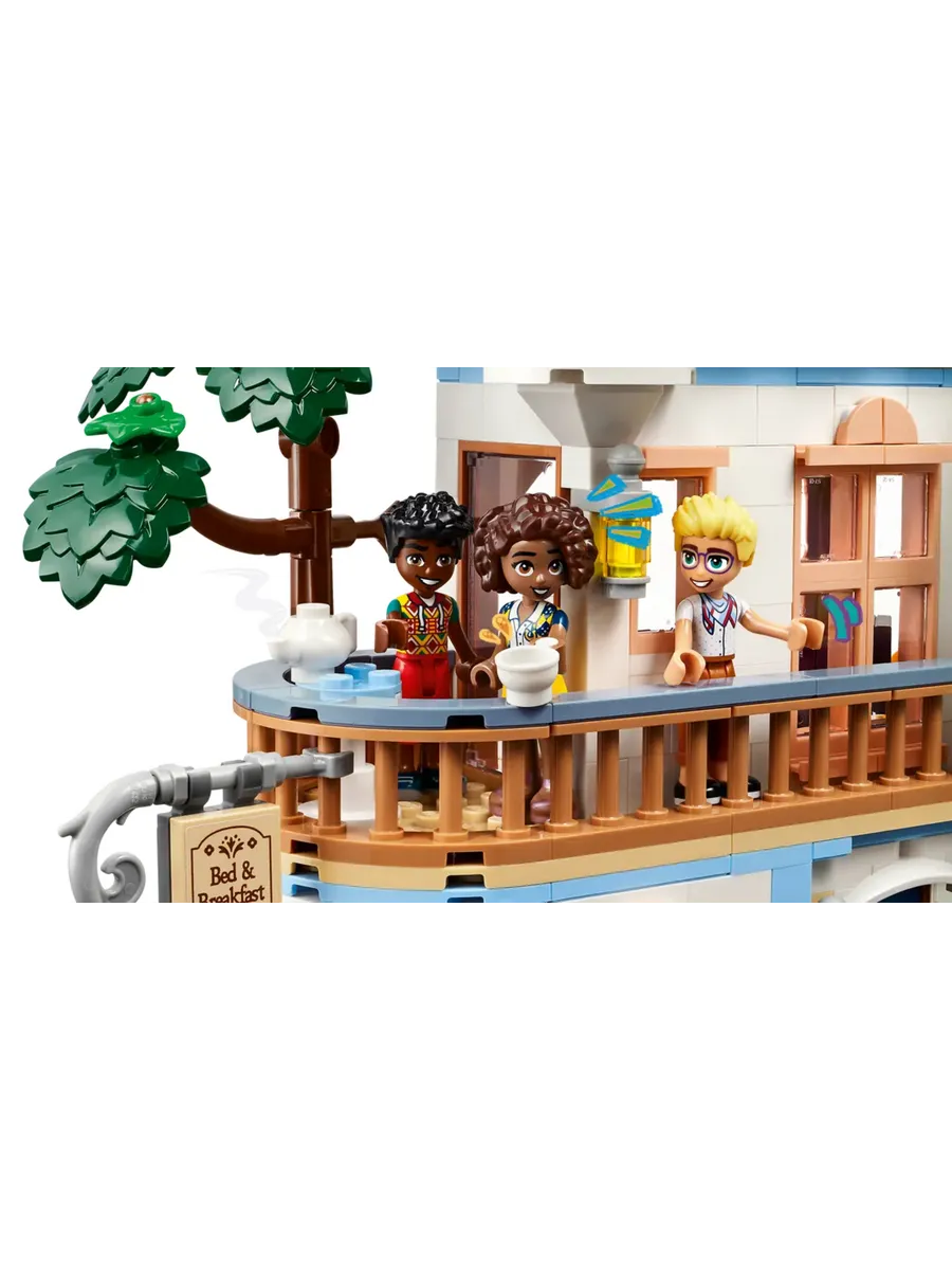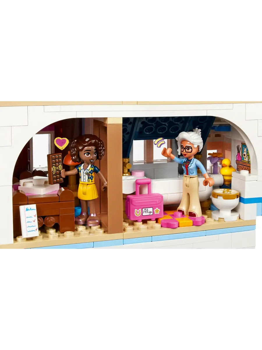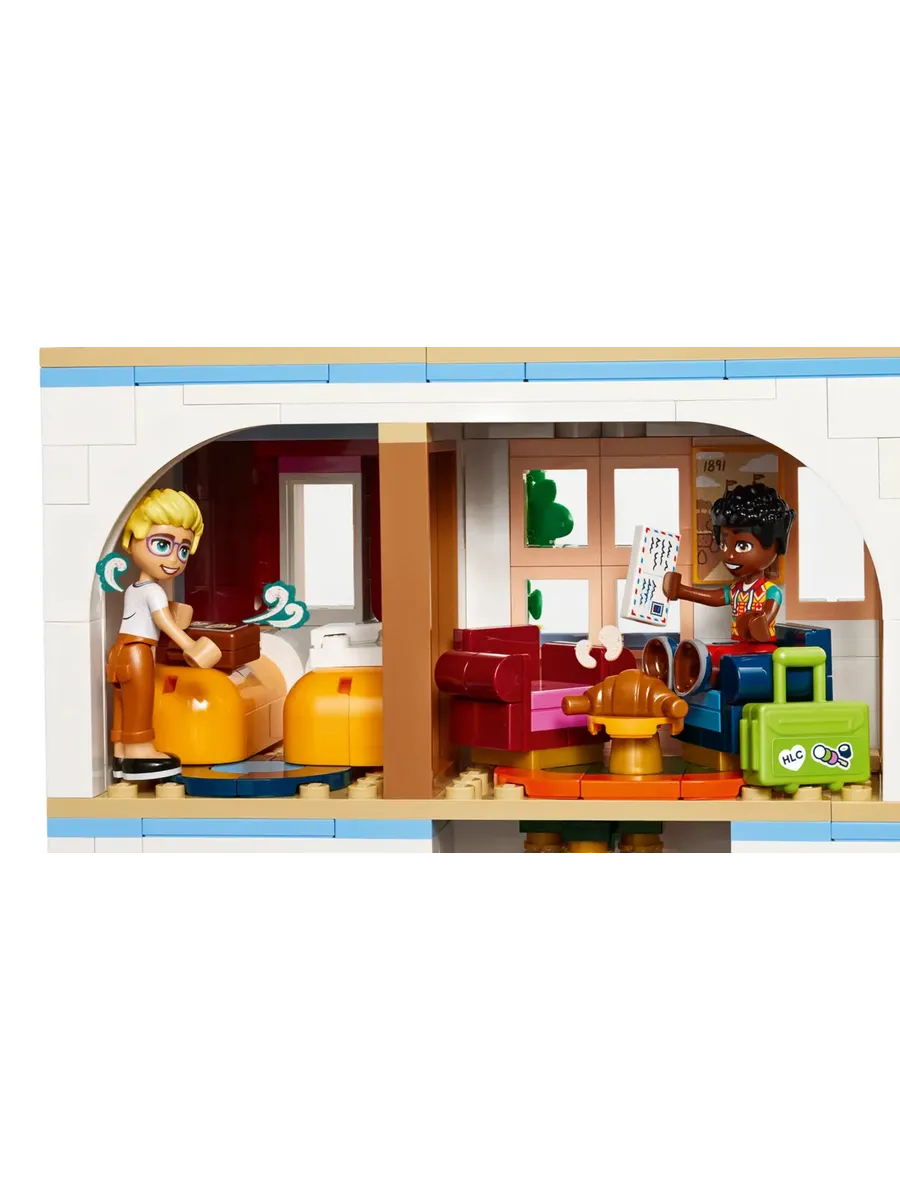 4 игровые фигурки и собака: в набор входят 4 игровые фигурки, в том числе гости отеля Зак, Олли и Алия с чемоданами, а также владелица отеля Рене и её собака. Размеры: высота отеля из этого набора из 1311 деталей составляет 31 см, ширина — 21 см, а глубина — 12 см.