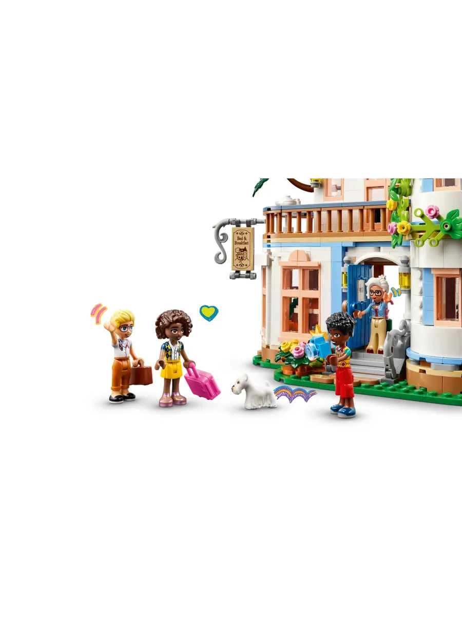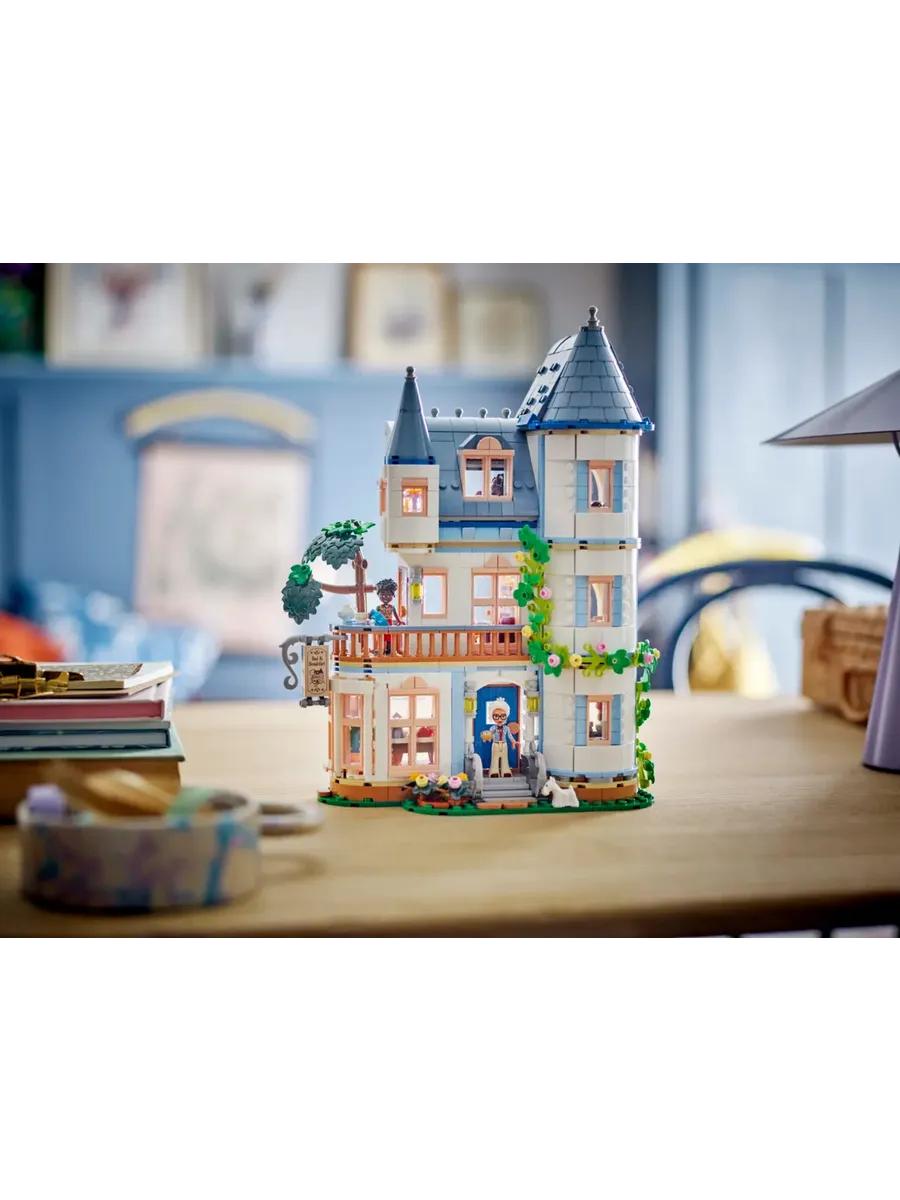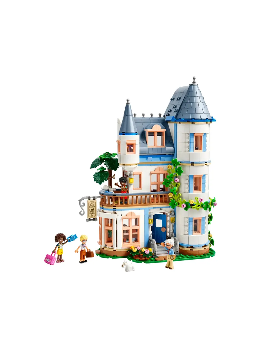 4 игровые фигурки и собака: в набор входят 4 игровые фигурки, в том числе гости отеля Зак, Олли и Алия с чемоданами, а также владелица отеля Рене и её собака. Размеры: высота отеля из этого набора из 1311 деталей составляет 31 см, ширина — 21 см, а глубина — 12 см.
