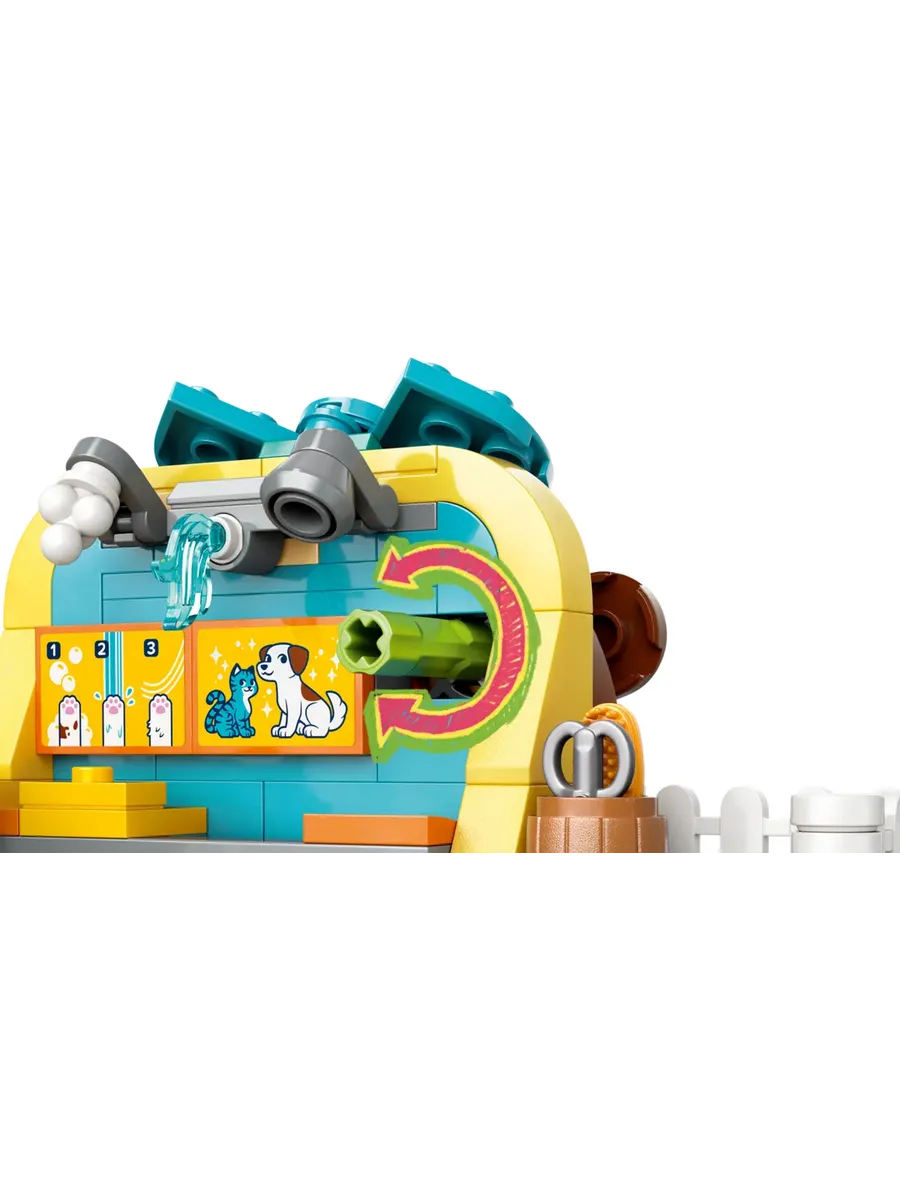 Поднимитесь на лифте. Среди милых деталей игрушки — лифт, который доставляет питомцев на станцию груминга, и конвейерная лента, которая перемещает их через станции намыливания, мытья и сушки.